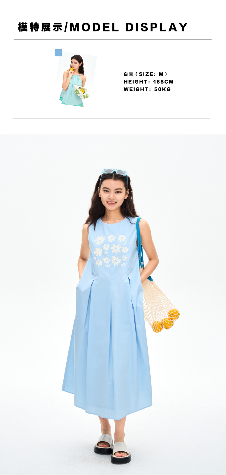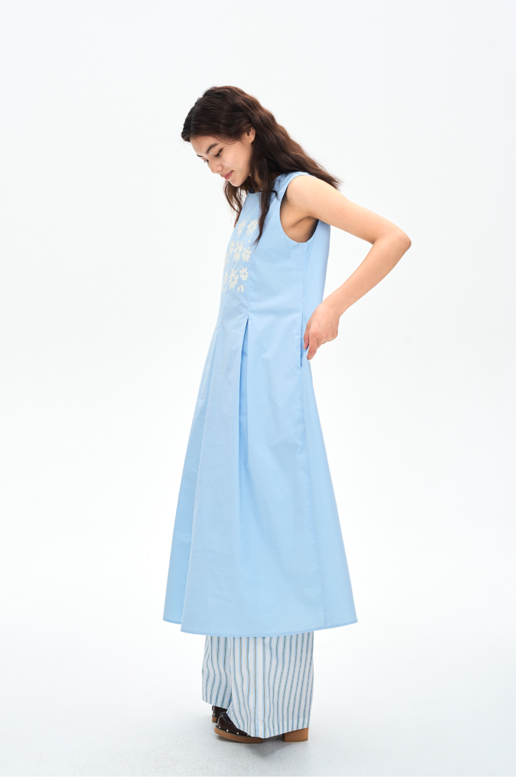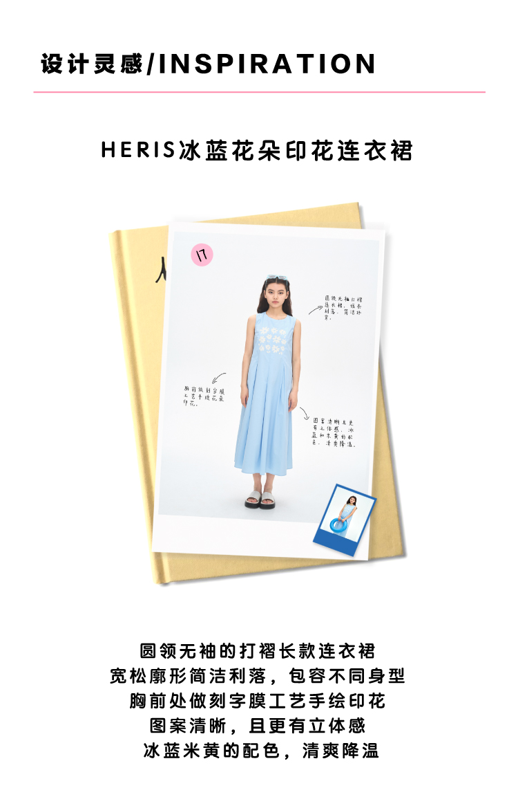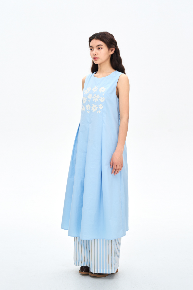 heris/H42107/冰蓝花朵印花 学院百褶A摆气质 圆领宽松无袖连衣裙