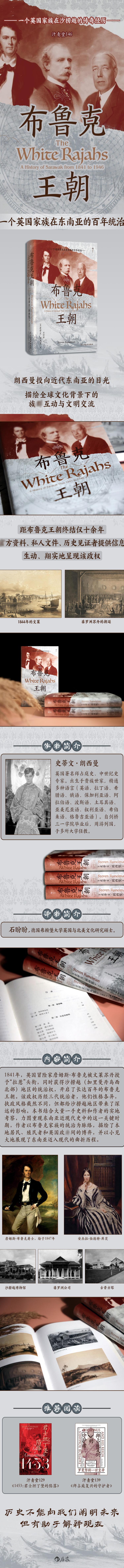 1841年,英国冒险家詹姆斯·布鲁克被文莱苏丹授予“拉惹”头衔,同时获得沙捞越(加里曼丹岛西北部)地区的统治权,开启了长达百年的布鲁克王朝。该政权历经三代统治者,他们性格各异,执政风格截然不同,但都给沙捞越地区带来了深远的影响。本书结合大量一手史料和作者的实地考察,力图重现东南亚近现代史中的这一关键时期,作者以布鲁克家族的统治为脉络,描绘了本地居民、殖民者和英国政府间的博弈,并以小见大地展现了东南亚迈入现代的曲折历程。