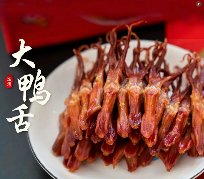 温州鸭舌是家喻户晓的最具代表性的特色美食,属于浙菜系凉菜。它是当地人情感联结的味觉符号也是地域饮食文化的载体,不仅是美食,更是温州特色的具象表达。是浙江人小时候的回忆,是特色小吃,也属于浙菜系。 他们将鸭舌称作“鸭赚”,因为在温州话中,“舌”的发音与“亏”很相近,而温州商人众多,故而较为“鸭赚”更为吉利。我们这款选择的鸭舌都是招牌大鸭舌 个顶个的大,绝对吃到爽!