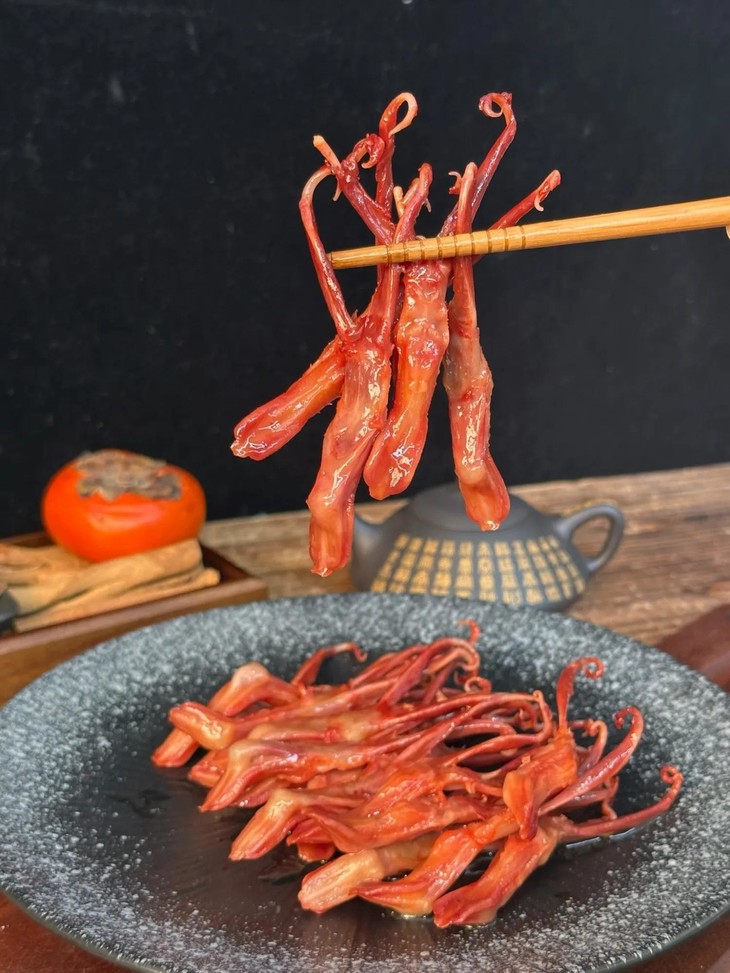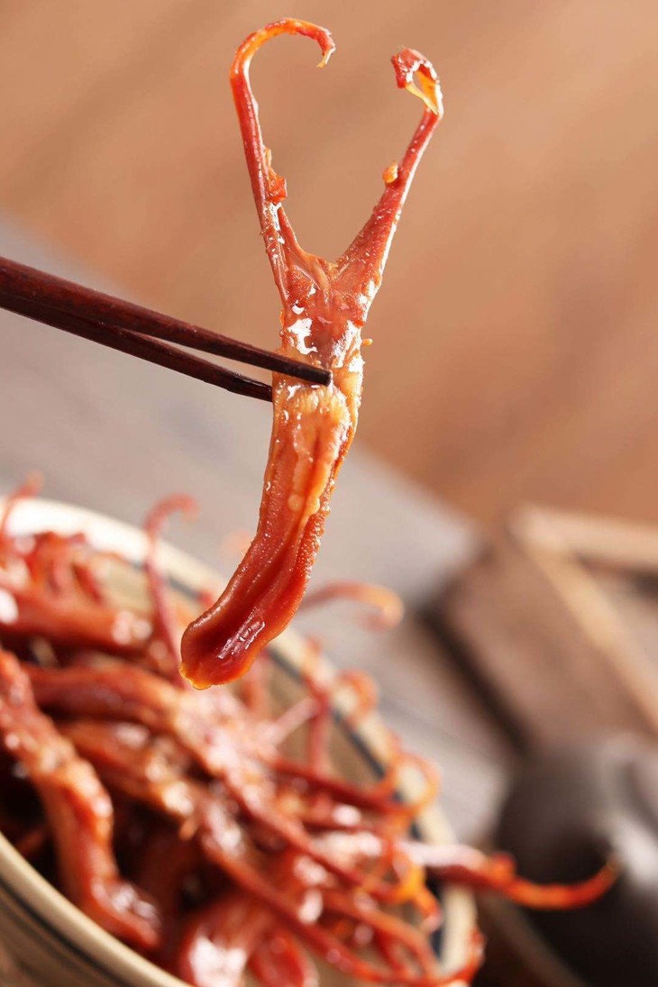 市面上大多是卤制工艺鸭舌,出品率高,但口感绵软腥味也重! 而正宗的温州鸭舌先烘烤把原有的水分烤出去,再进行卤制工艺激发鸭舌特有的香味和韧性口感,1斤的原料才能做出半斤!尝一口肉质丰腴紧实,骨肉相间带来的嚼劲感,越嚼越香,一口一个回味无穷。