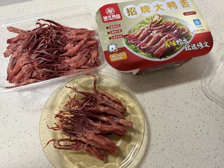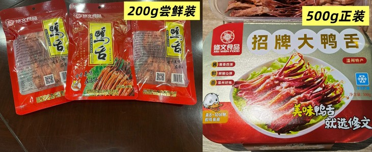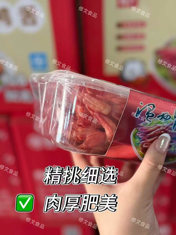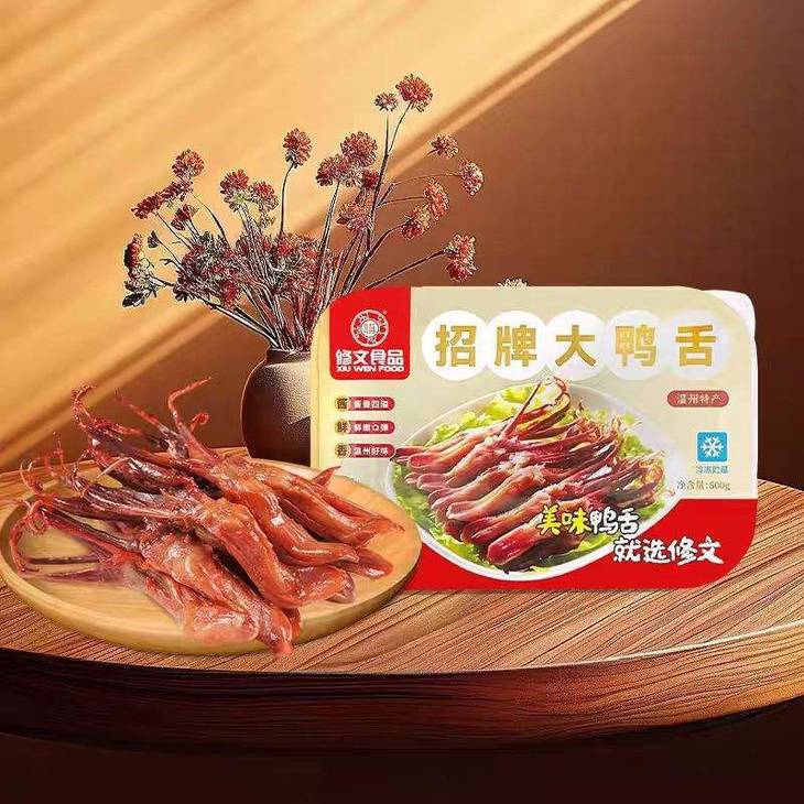 修文大鸭舌:大家都爱的美味品控全链路放心选 我们做了多轮盲选试吃:市面上的畅销款、高品质款、生制熟制、辣味卤味……层层筛选后,仅有4款进入初审组。 而最终,大家试吃一致认为风味更胜一筹的,正是修文家的招牌大鸭舌! 内里的肉质紧实,口感弹牙搭配上温州独特的香料和烹饪工艺 简直是人间美味,一口接一口,根本停不下来。 每一口都充满着口感独特的鲜香诱人,让你欲罢不能,回味无穷。