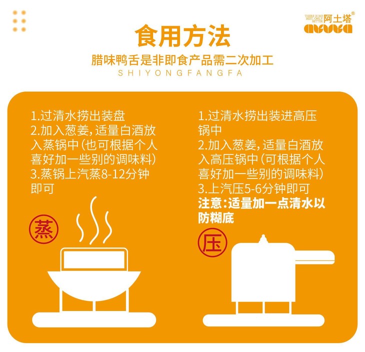 ✅ 最佳吃法:直接加热:简单烹饪、尽享美味 姐妹们,鸭舌需冷冻保存, 吃的时候,先解冻, 然后放葱、姜、2勺白酒, 蒸15分钟,或高压锅压5一6分钟即可。蒸好的鸭舌色如琥珀、酱香浓郁。肉质鲜嫩,富有嚼劲 鸭舌的做法很多,直接蒸、可乐鸭舌、香辣鸭舌、空气炸锅..... 无论是当小食、下酒菜,还是当酒席凉菜,都非常合适。