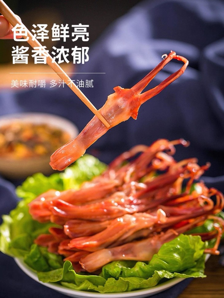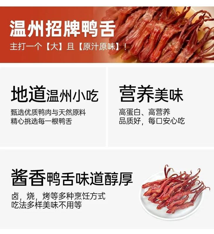 地道温州经典名小吃 ✅ 独特的风味,精湛的制作工艺 甄选优质鸭天然调料 ✅品质好,每口安心吃 高蛋白、高营养 Ps:一般鸭舌不说根数,说斤数,因为鸭子有大小,养殖有季节。净克重只会多,不会少。 温州的酱香鸭舌味道醇厚,不仅是下酒好菜,也是绝佳零食,营养又美味。