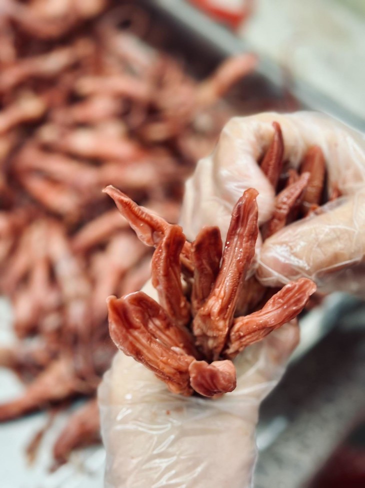 因为有这些规范性动作,修文鸭舌才能做到个头更均匀,更饱满。六和只供修文,所以就算国内用的全是樱桃谷的鸭,也很难做到像我们一样的品质。