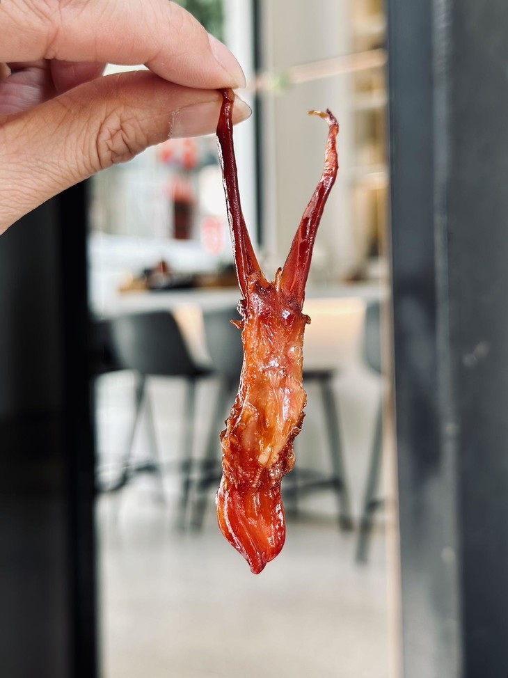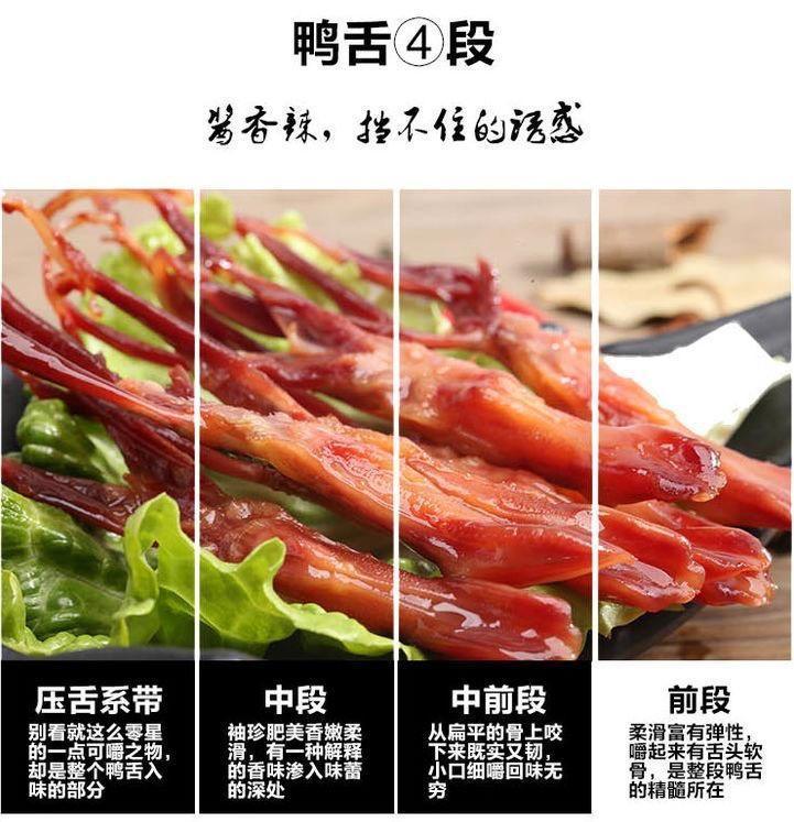 一根鸭舌可分为三部分。 其前端:柔滑舌尖是玲珑的肥美、柔滑而富有弹性,嚼起来还带有一点舌尖软骨,最为精彩。 中端:韧实相结韧与实的结合,从后端扁平的骨上扒拉下一块,更有一种结实的脂肪香味在那里。 后端:入味舌根还不可错过那两根细细小v小的舌系带,别看就那么零星的一点可嚼之物,却是整个鸭舌最为入味的一段。