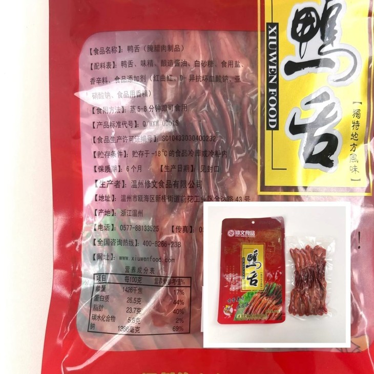 温州修文食品有限公司是一家以生产鸭舌为主的企业,创办至今已经20多年, 修文鸭舌的特点是“大”和“原汁原味”,温州很多知名酒店的鸭舌都是他家**的。经过先烤后卤制,风至半干的鸭舌,口感韧性十足,颇为耐嚼,其独特的制作工艺也使得鸭舌称为温州的一张美食名片!