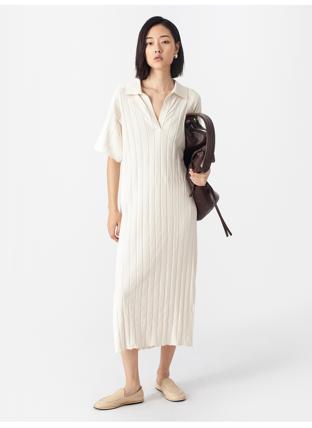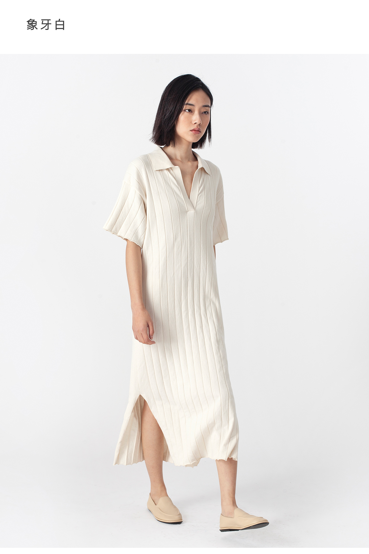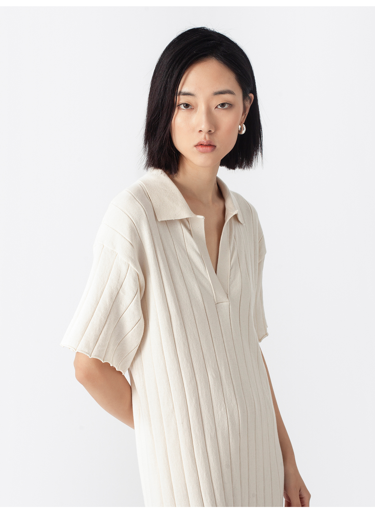 322工房质感棉羊绒坑条针织连衣裙2023春夏经典polo领长裙女B025