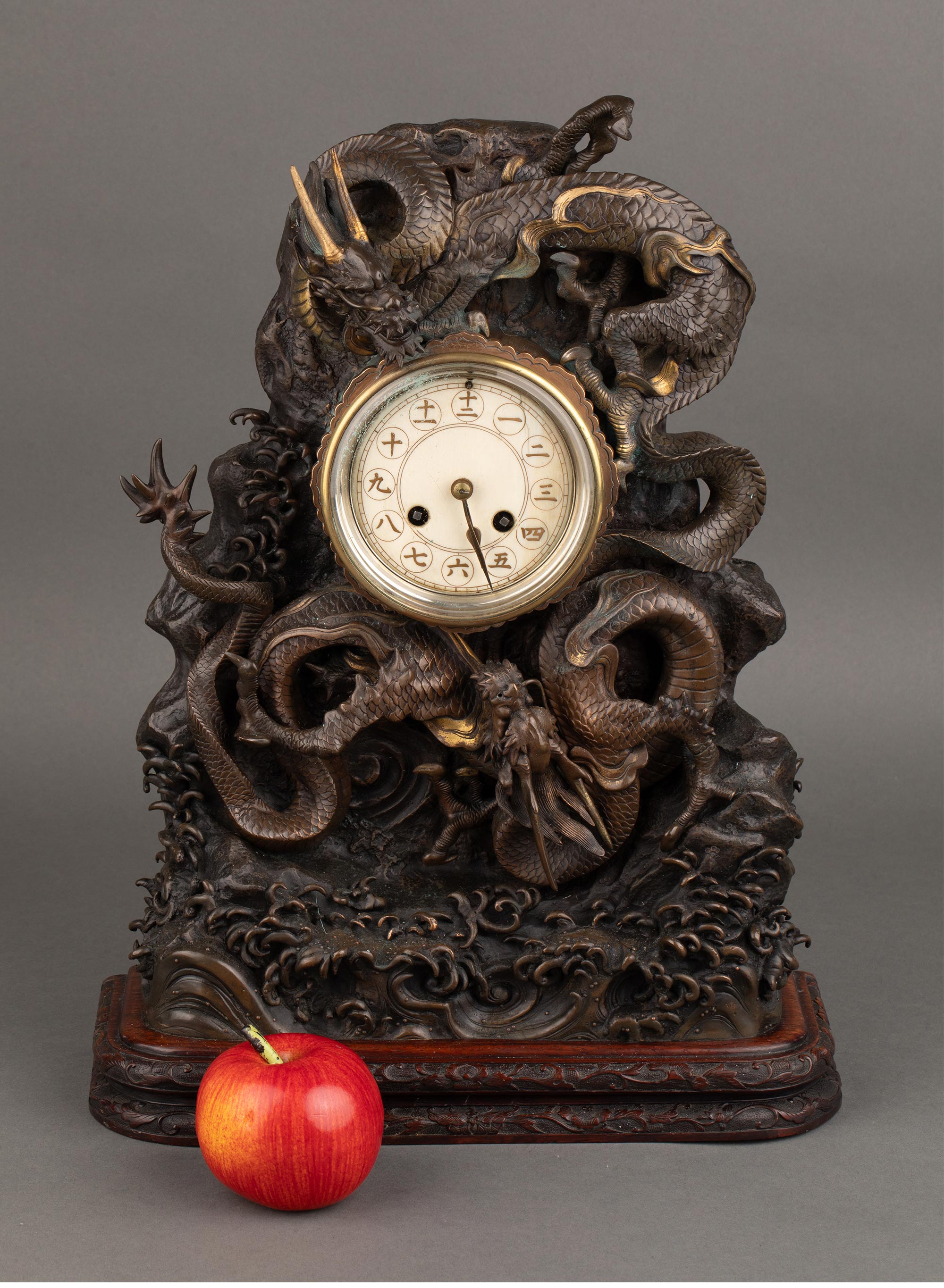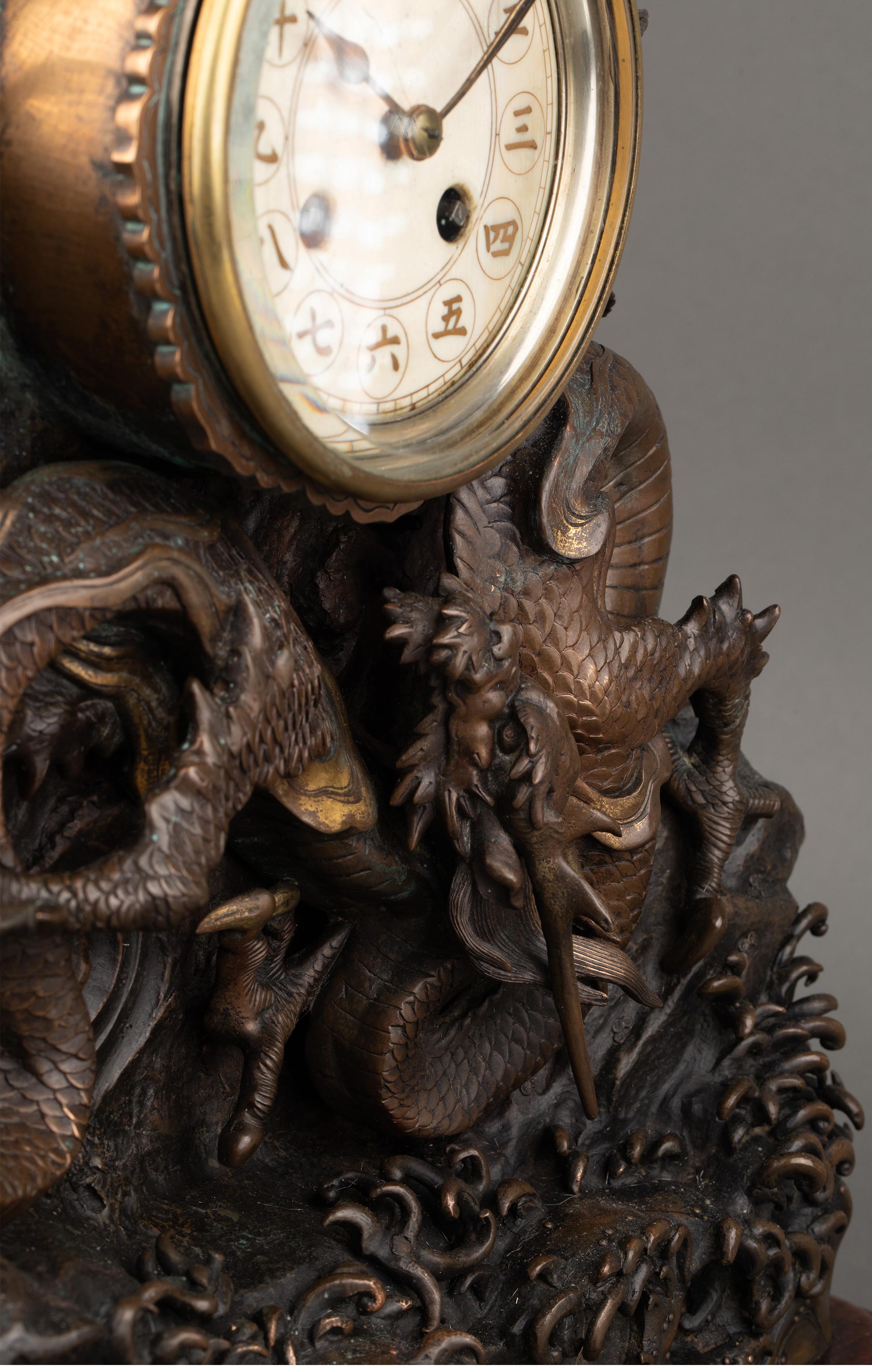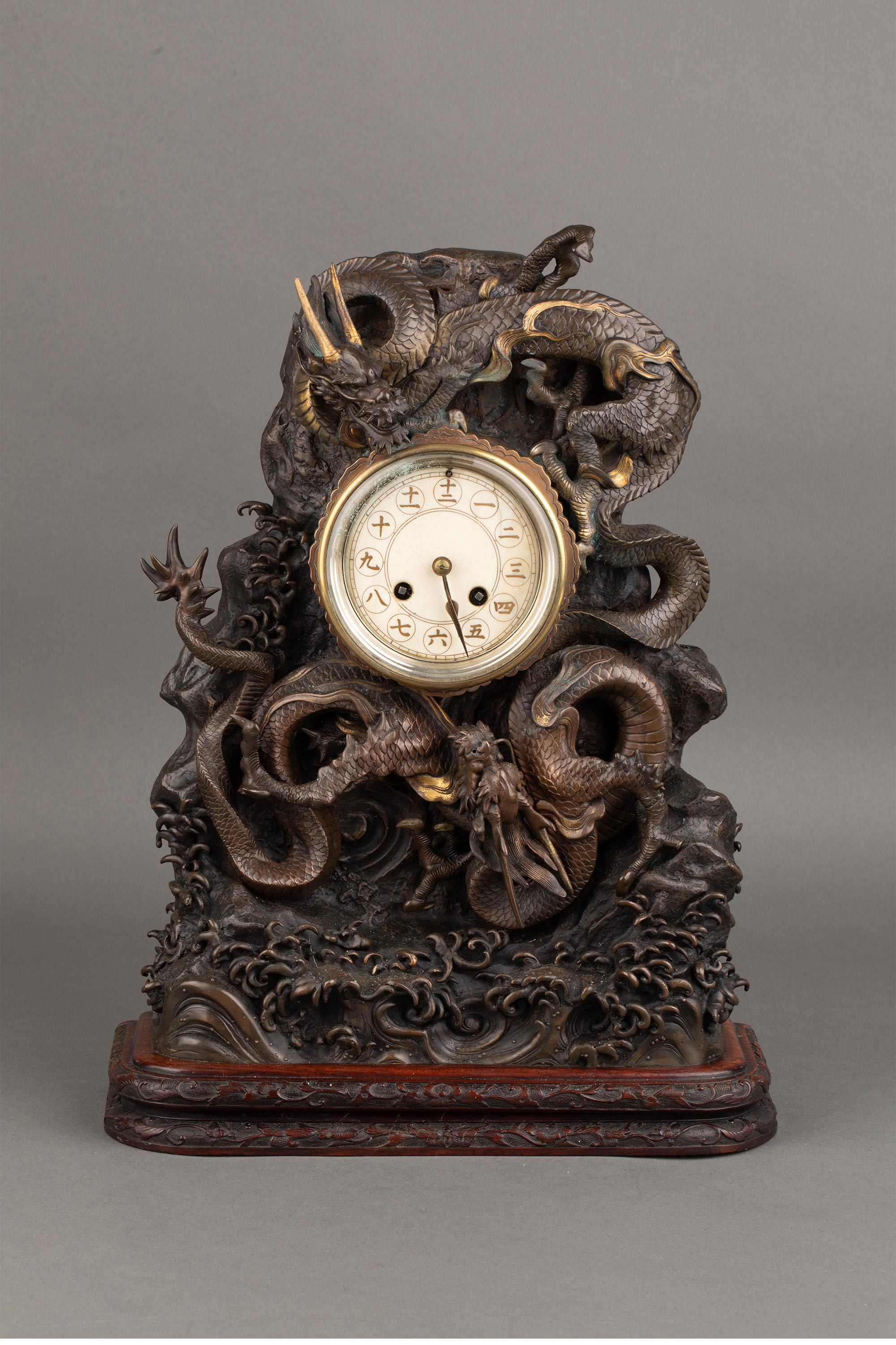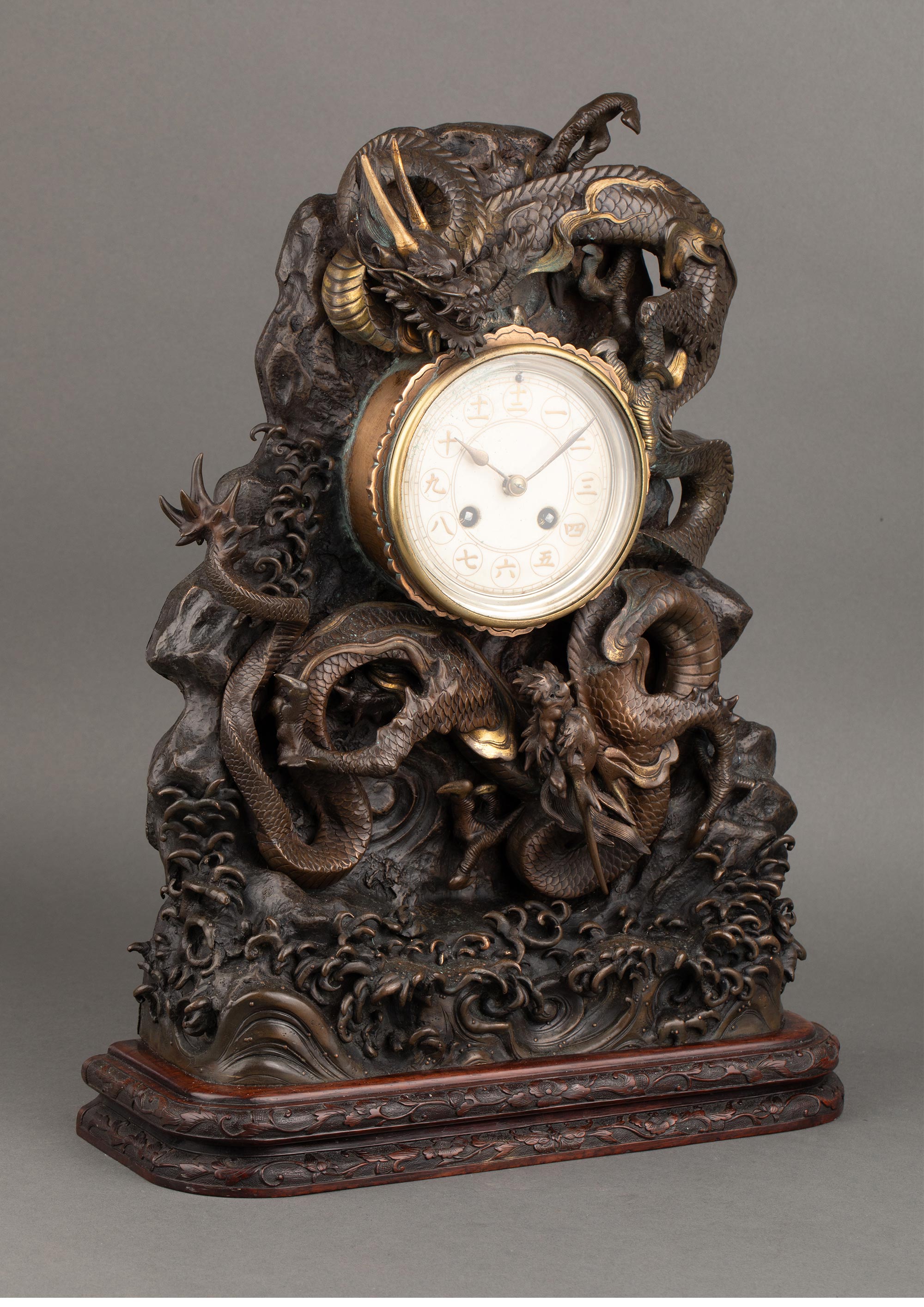 1880年代日本明治时期出品卷叶纹硬木精雕底座装饰东方盘龙主题镀金铜雕座钟