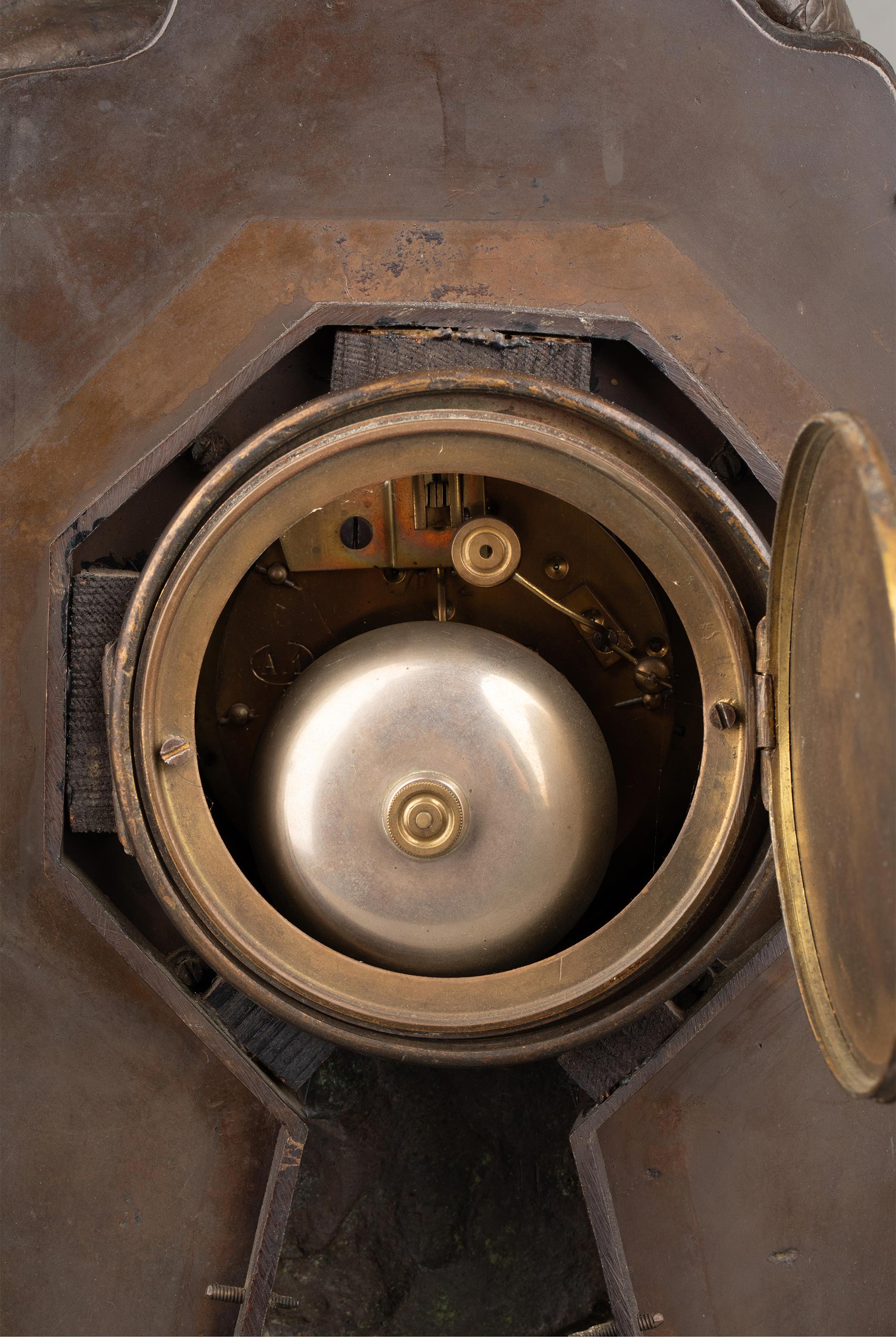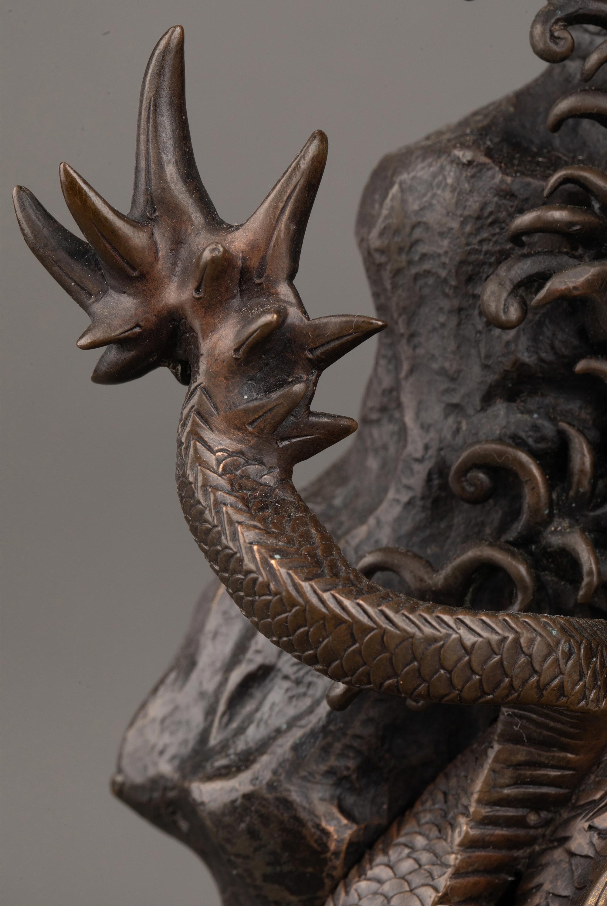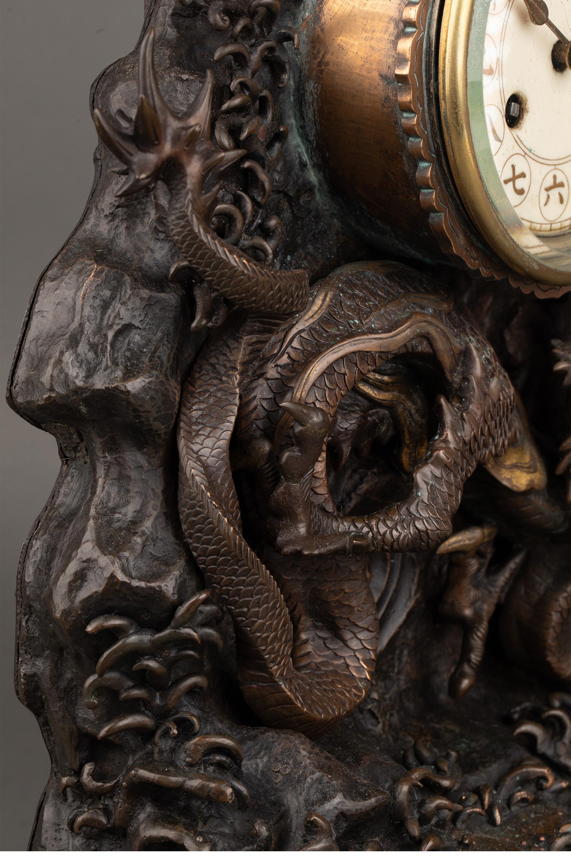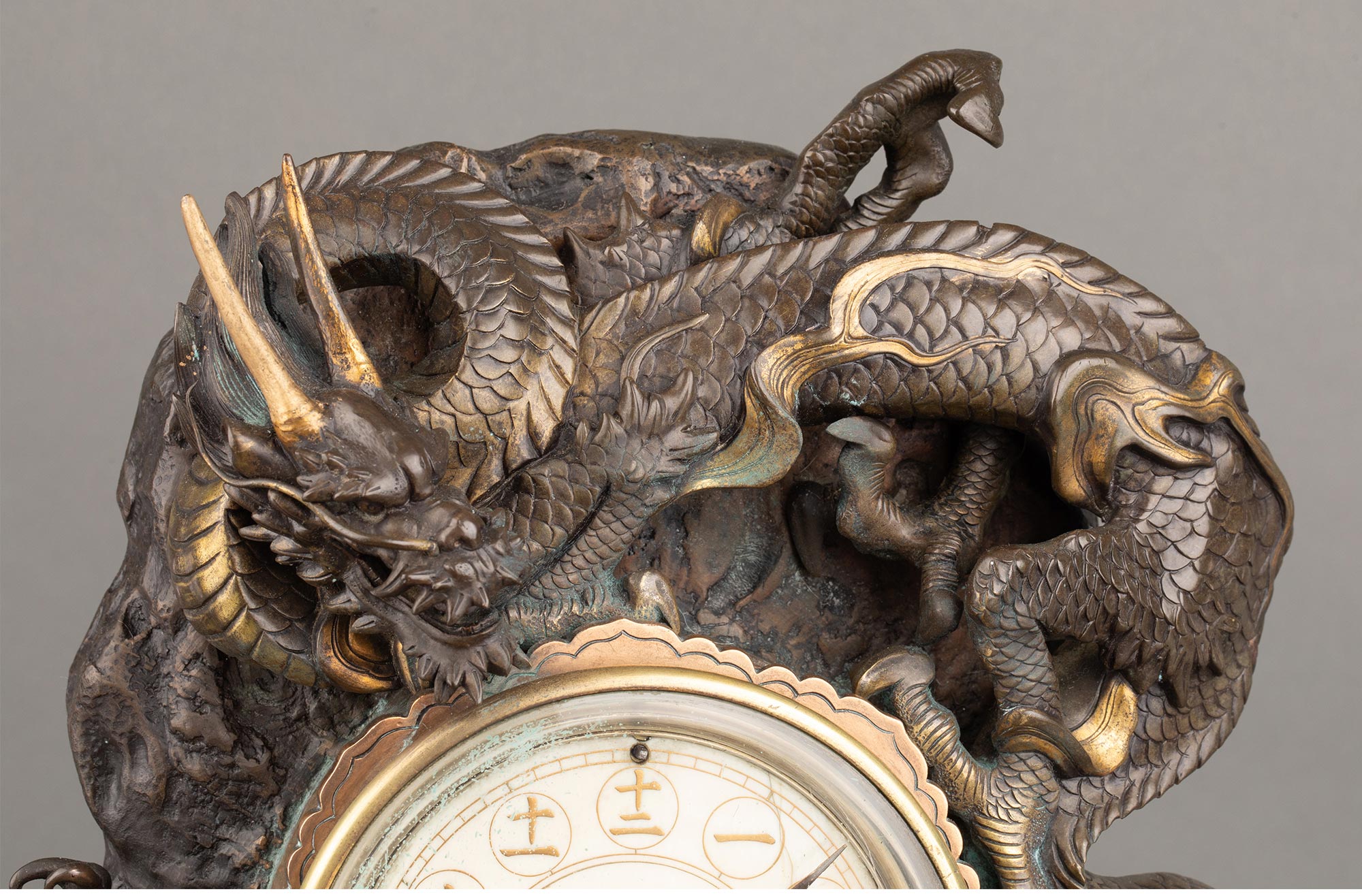 1880年代日本明治时期出品卷叶纹硬木精雕底座装饰东方盘龙主题镀金铜雕座钟