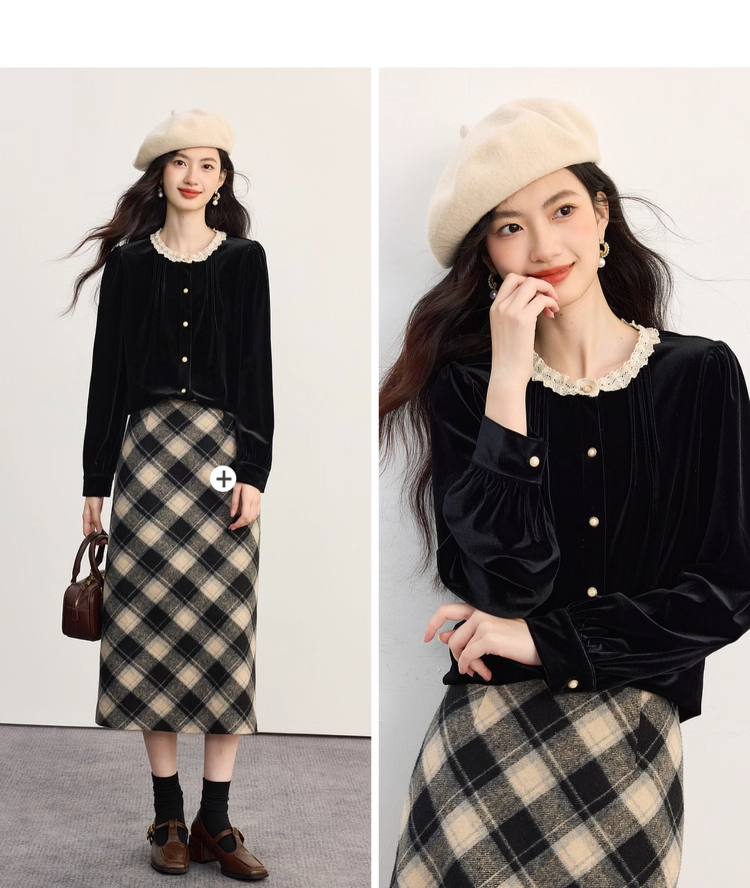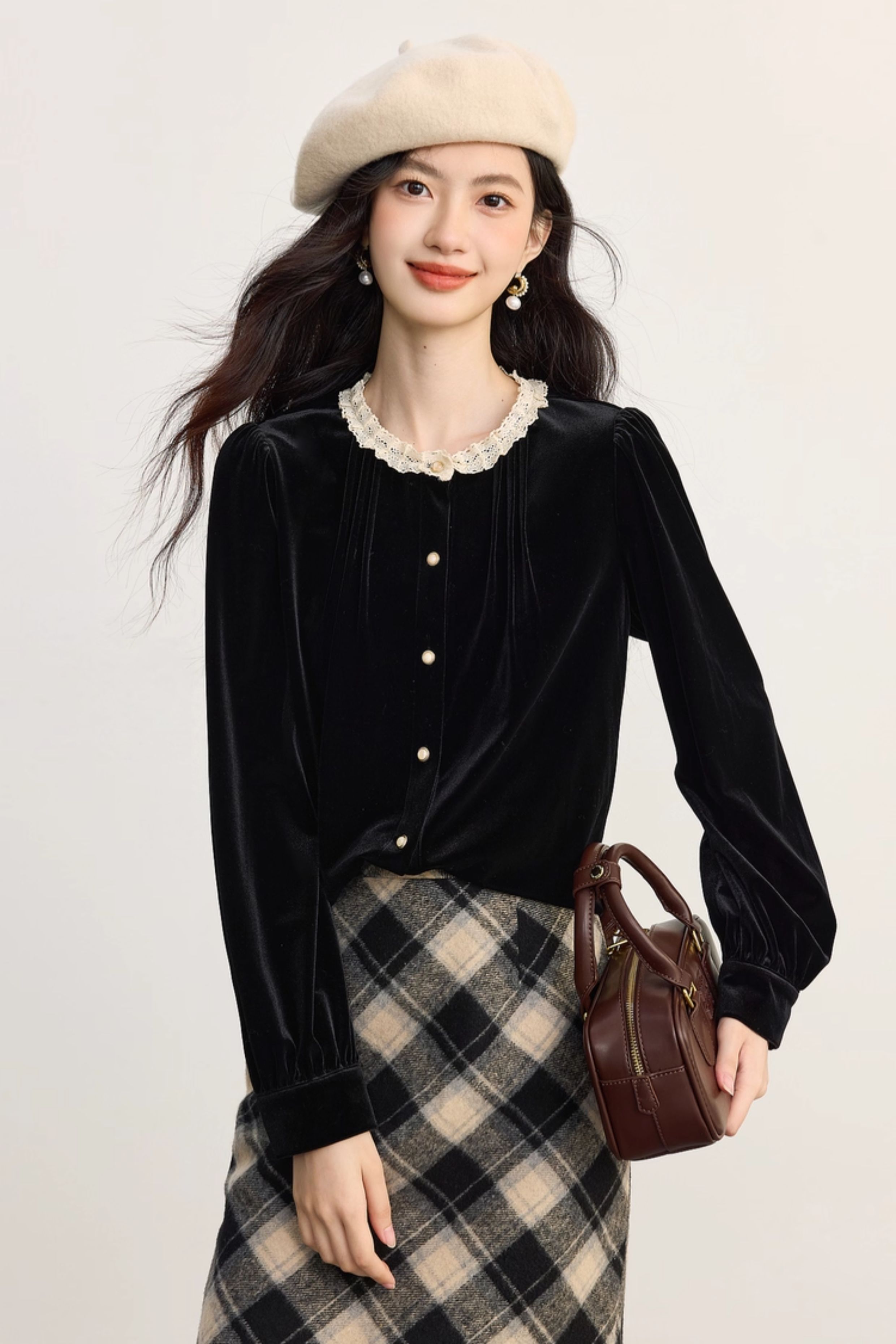 【09/26新品】熙世界光泽感黑色金丝绒衬衫女长袖秋冬款法式千金风圆领花边上衣