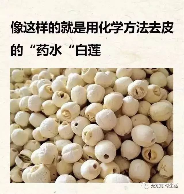药水泡过莲子,颜色比较均匀,没有一点红皮儿,没有清香味,煮过后也不膨胀,没有清香味儿,且口感发酸。这种泡过的莲子,用有增白剂,荧光粉t等添加物,看似漂亮,却非常不利于健康。