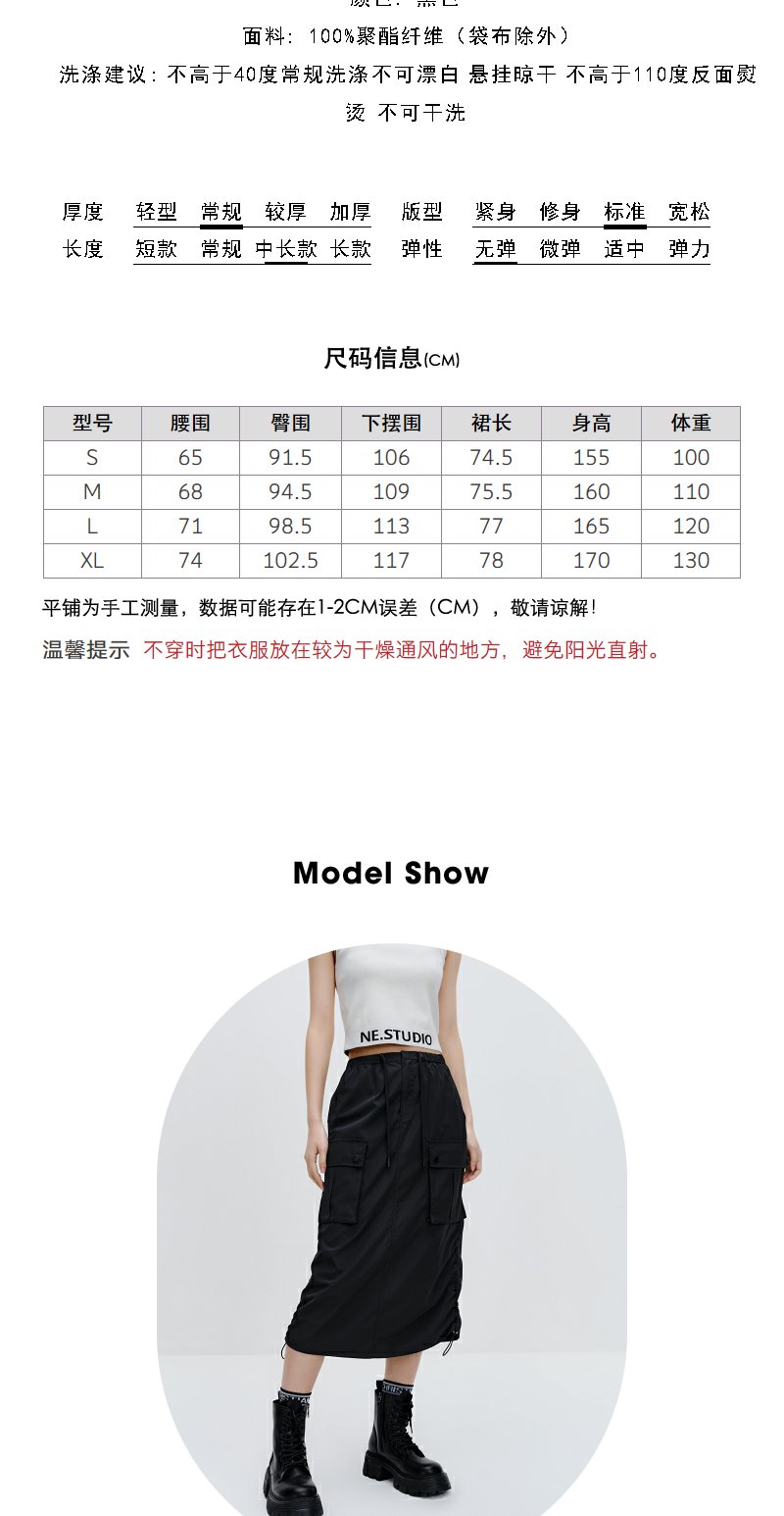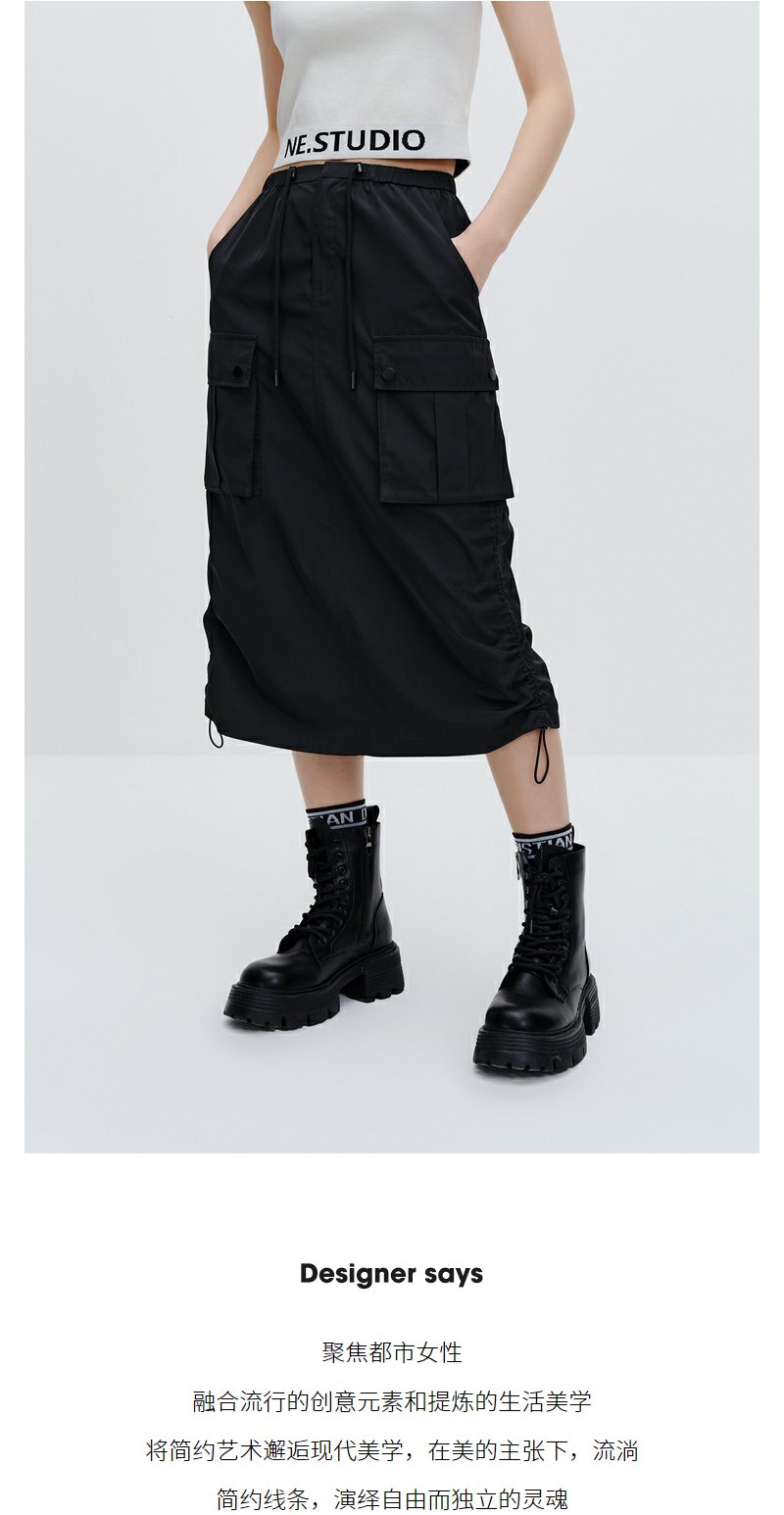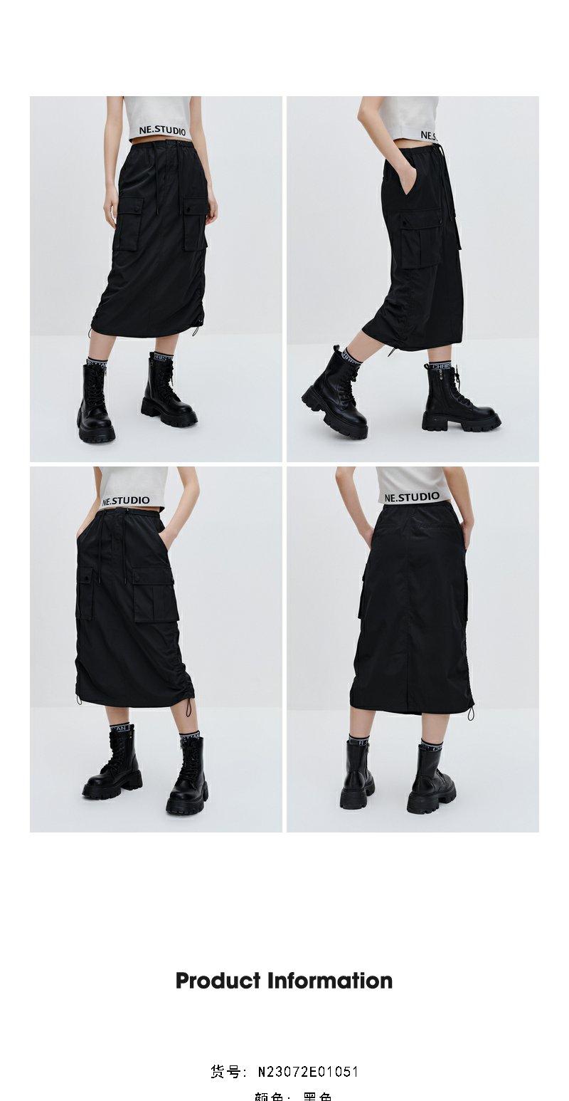 NEELLY纳俪商场同款工装半身裙女2023早秋新款黑色复古中长款半裙N23072E01051