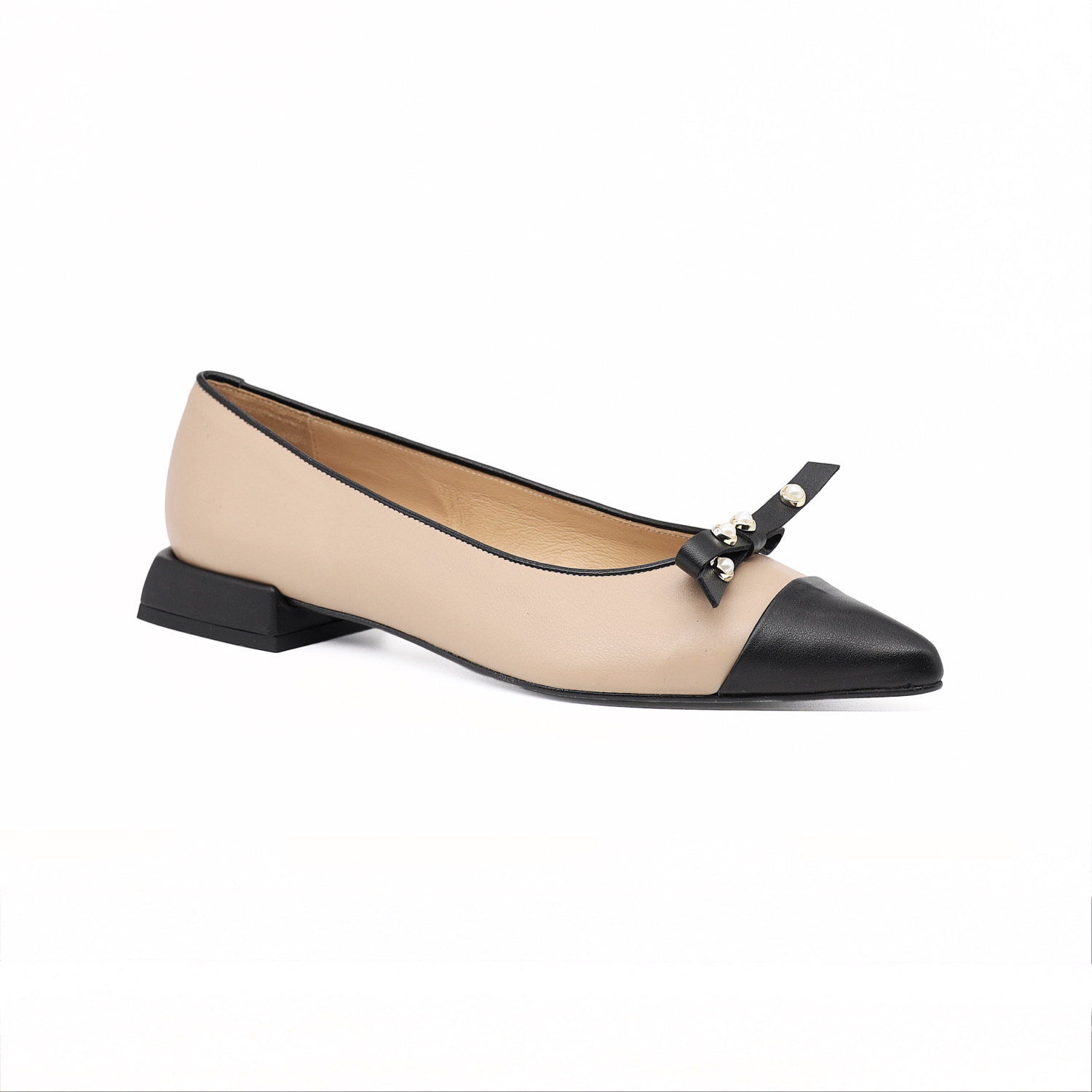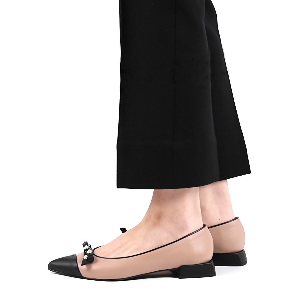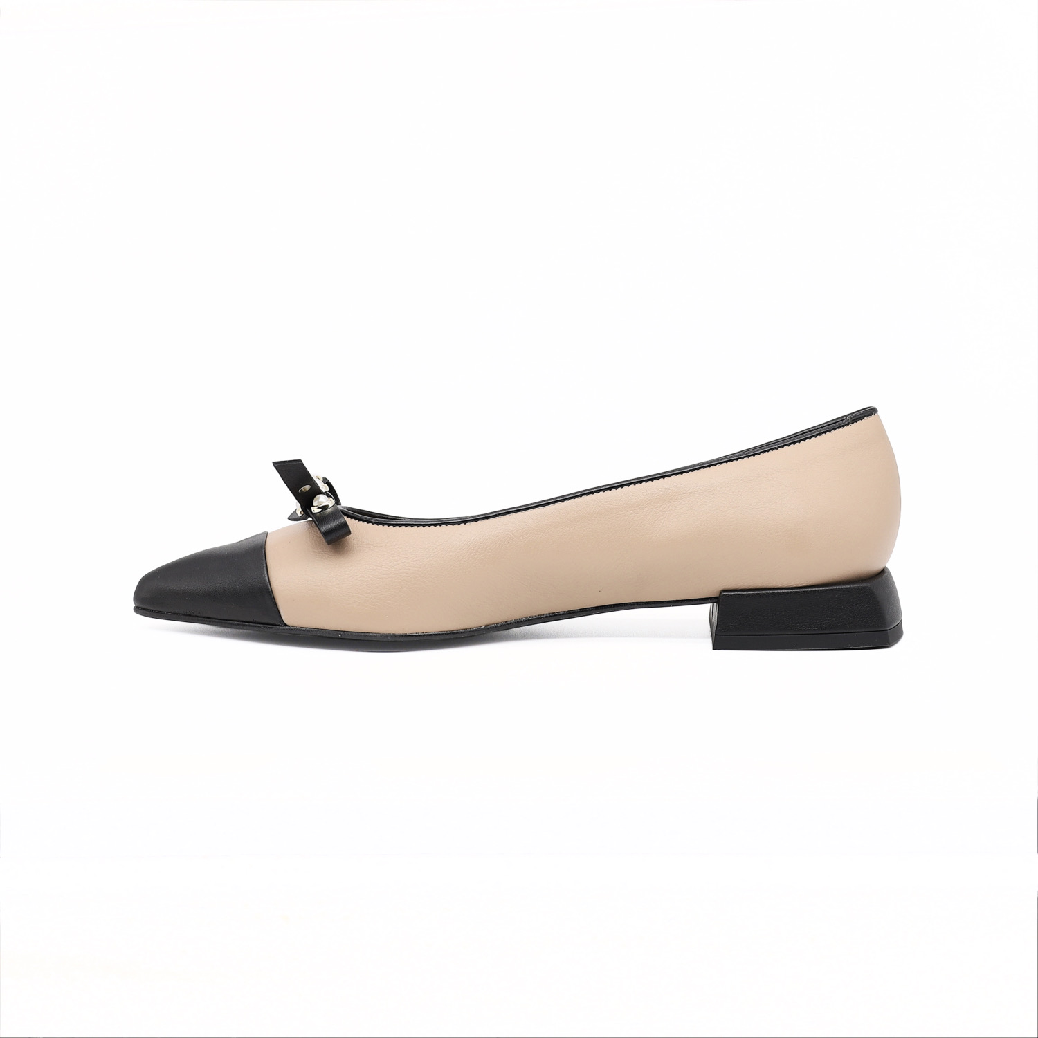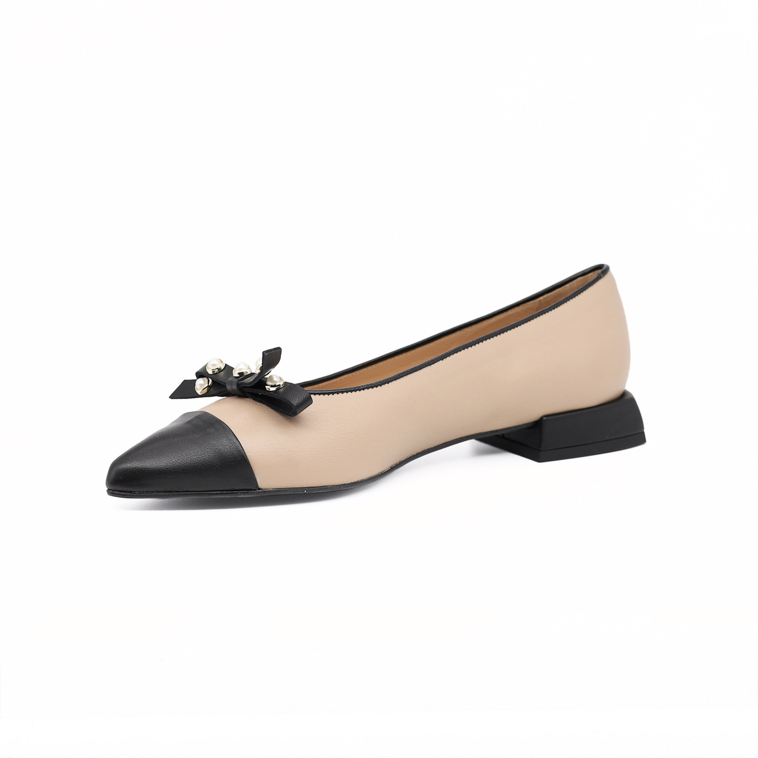 米色鞋面搭配黑色方型鞋跟与黑色时尚小尖头,尽显优雅时尚气质。