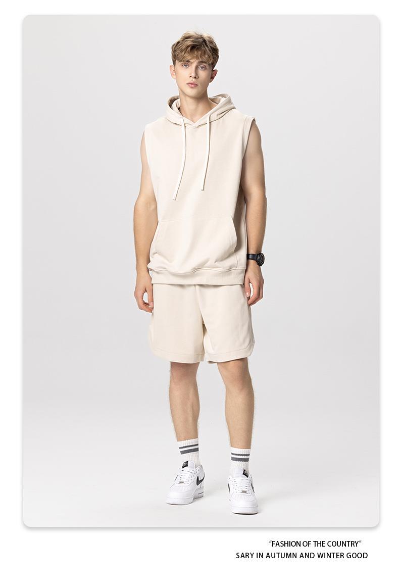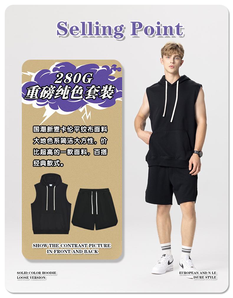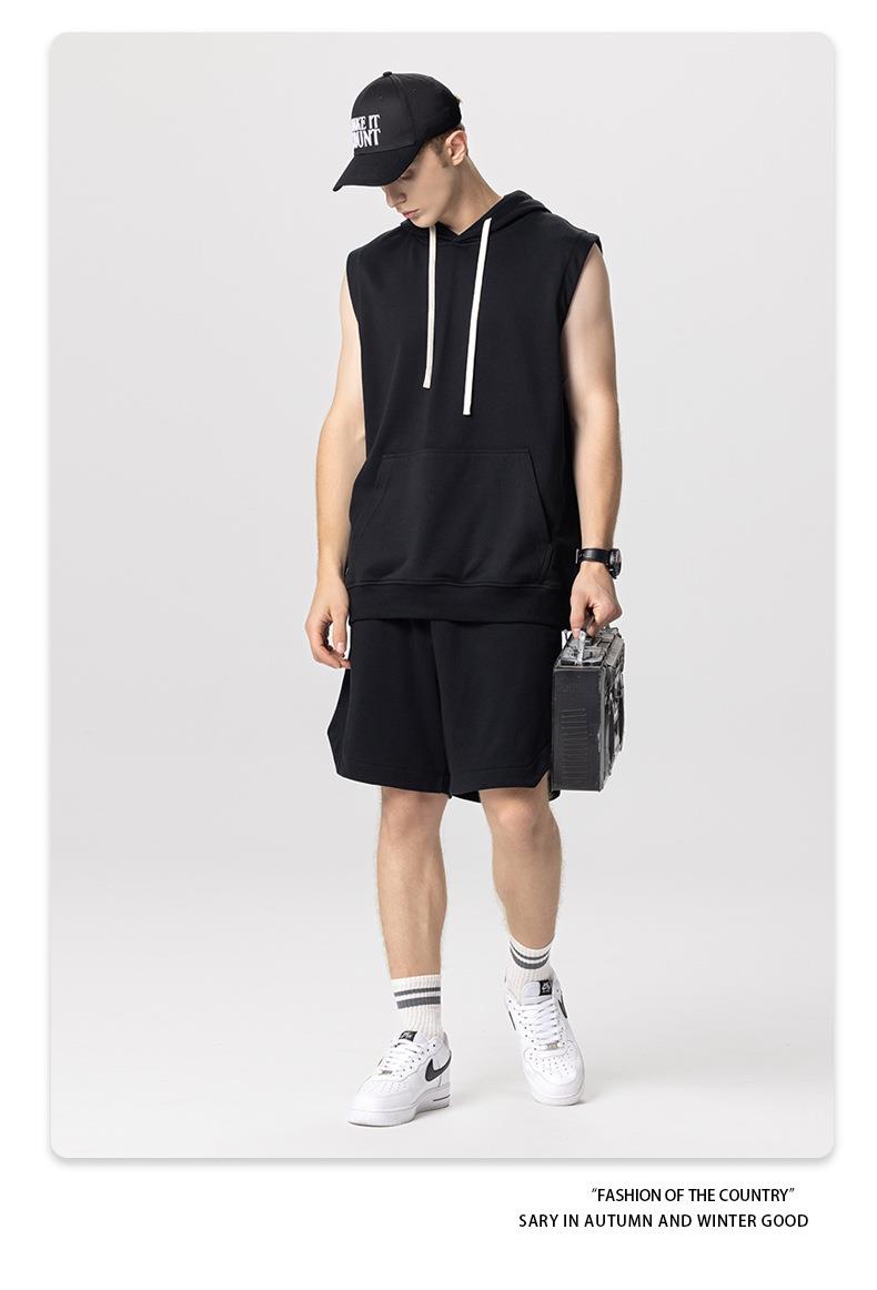 RS男装|2023夏季男女纯色连帽无袖T恤个性潮流坎肩休闲套装背心男