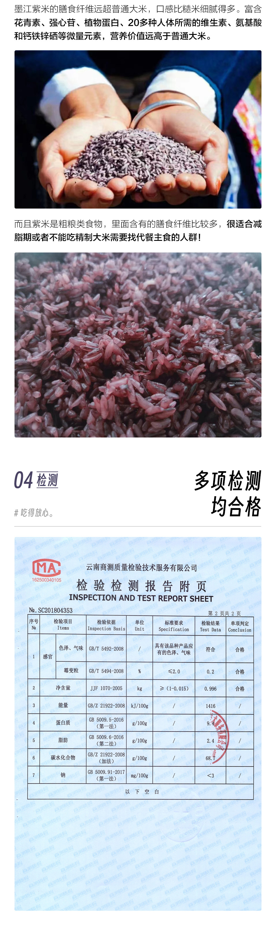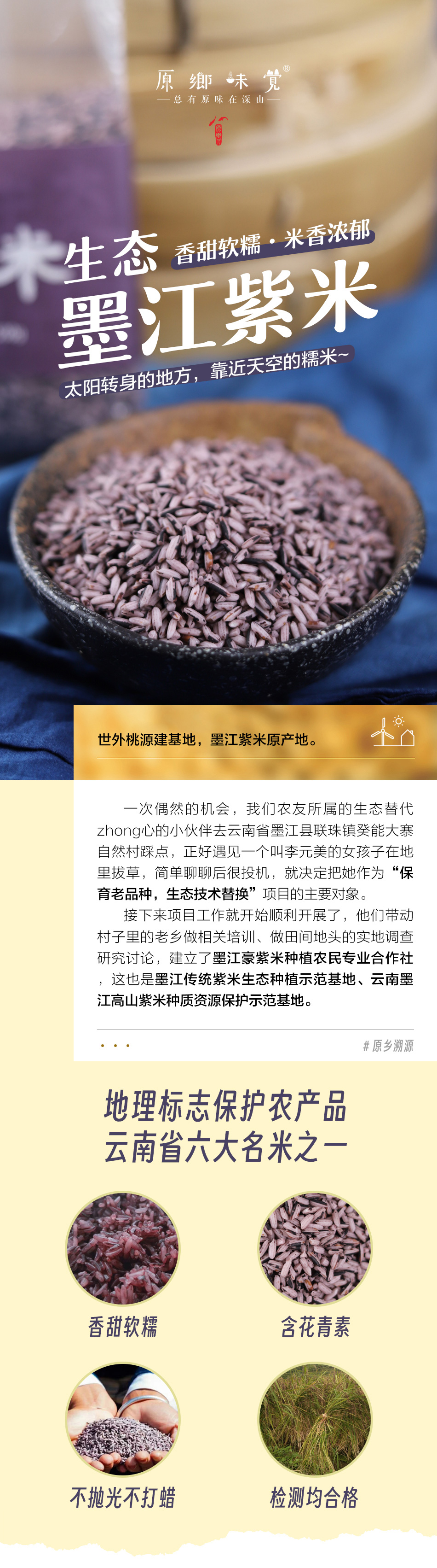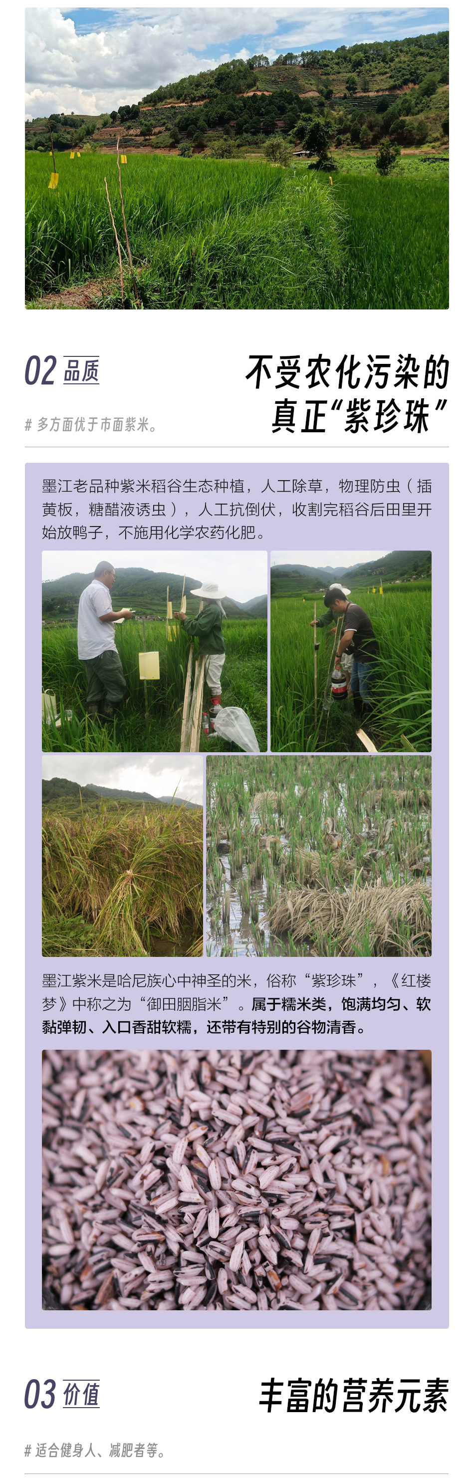 【生产者】:李元美 【规格】:500g 【生产日期】:见包装 【保质期】:8个月 【产地】:云南省普洱市墨江县联珠镇癸能大寨自然村 【品种】:本地老品种 【种植方式】:生态种植,人工除草,物理防虫(插黄板,糖醋液诱虫),人工抗倒伏,收割完稻谷后田里开始放鸭子,不施用化学农药化肥。