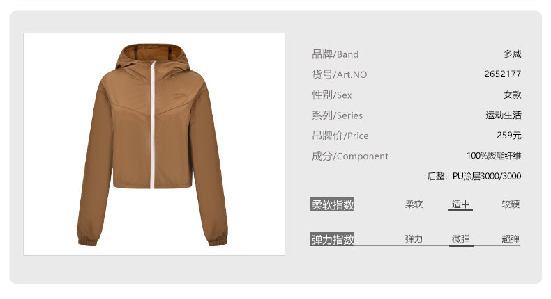 多威新品上衣连帽短款运动休闲女款轻薄外套2652177