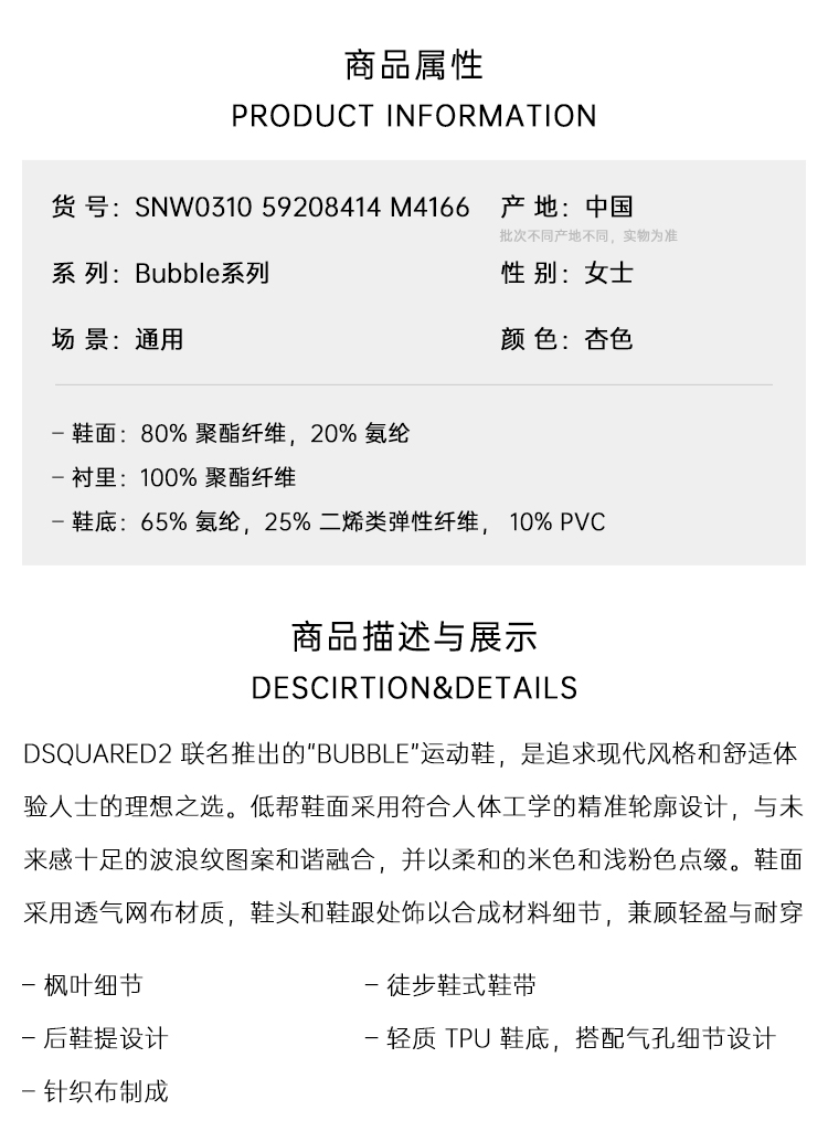 DSQUARED2 女士 Bubble系列 字母徽标休闲运动鞋 杏色 SNW0310 59208414 M4166