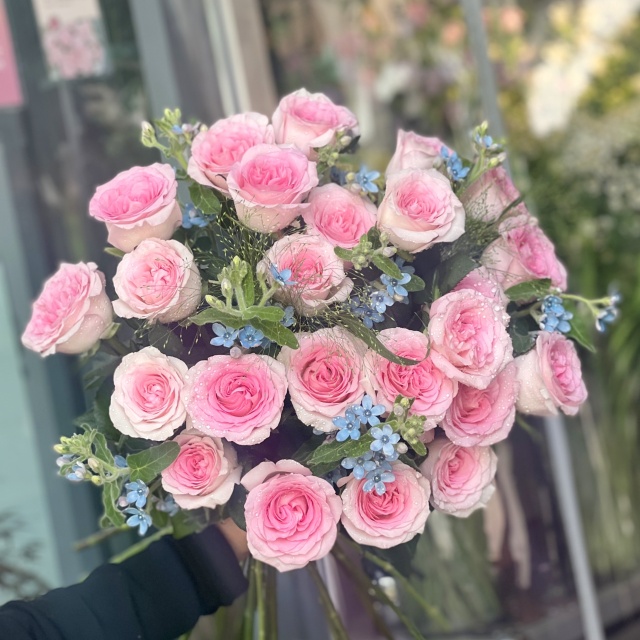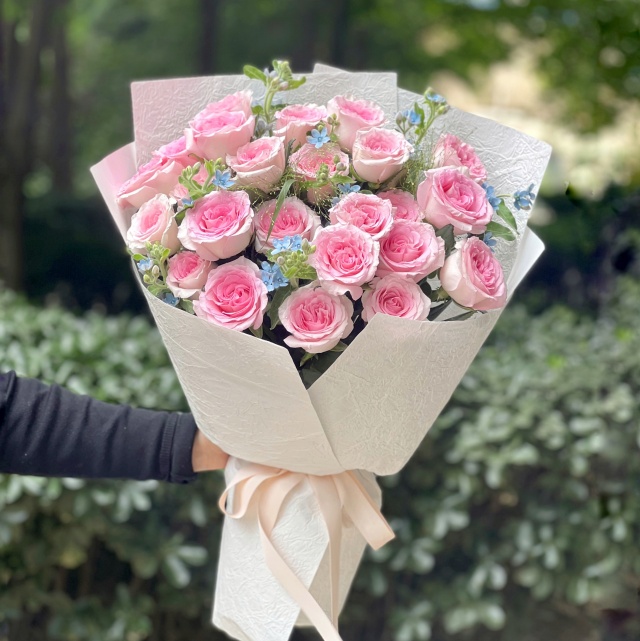 精选花材:24支洛神玫瑰,8支蓝星花,喷泉草搭配