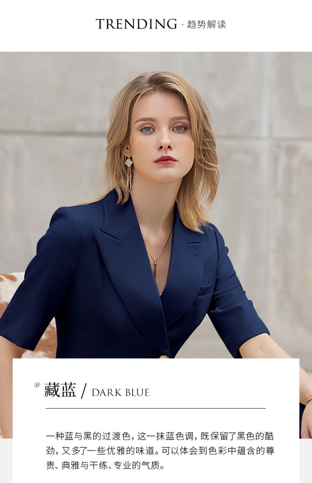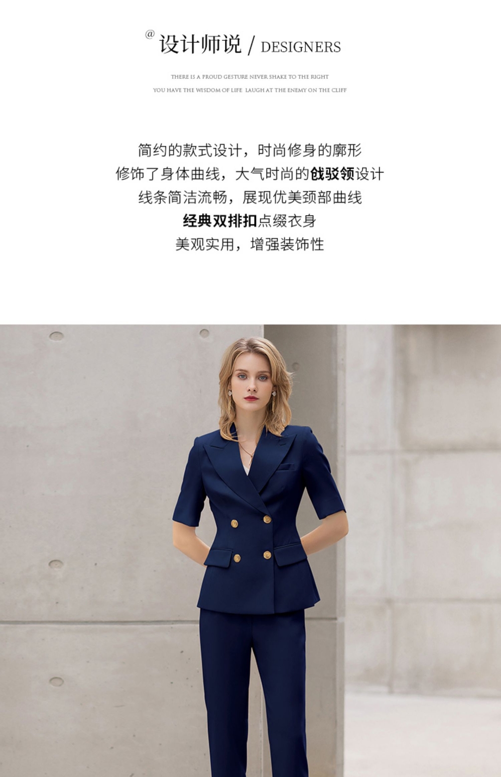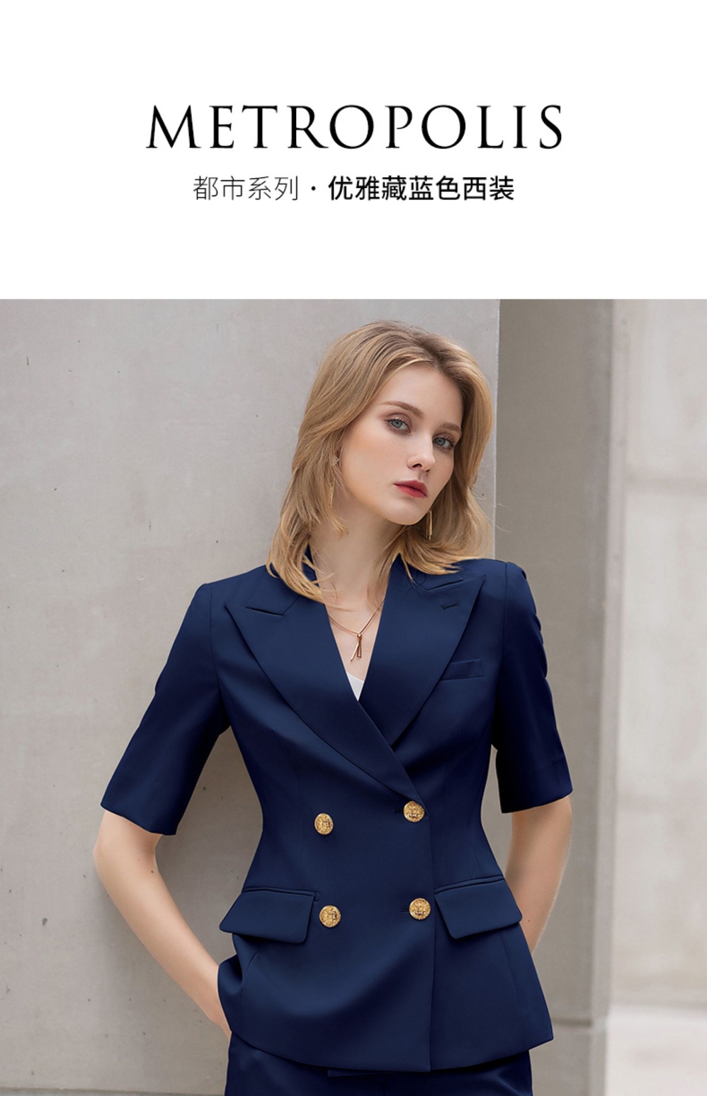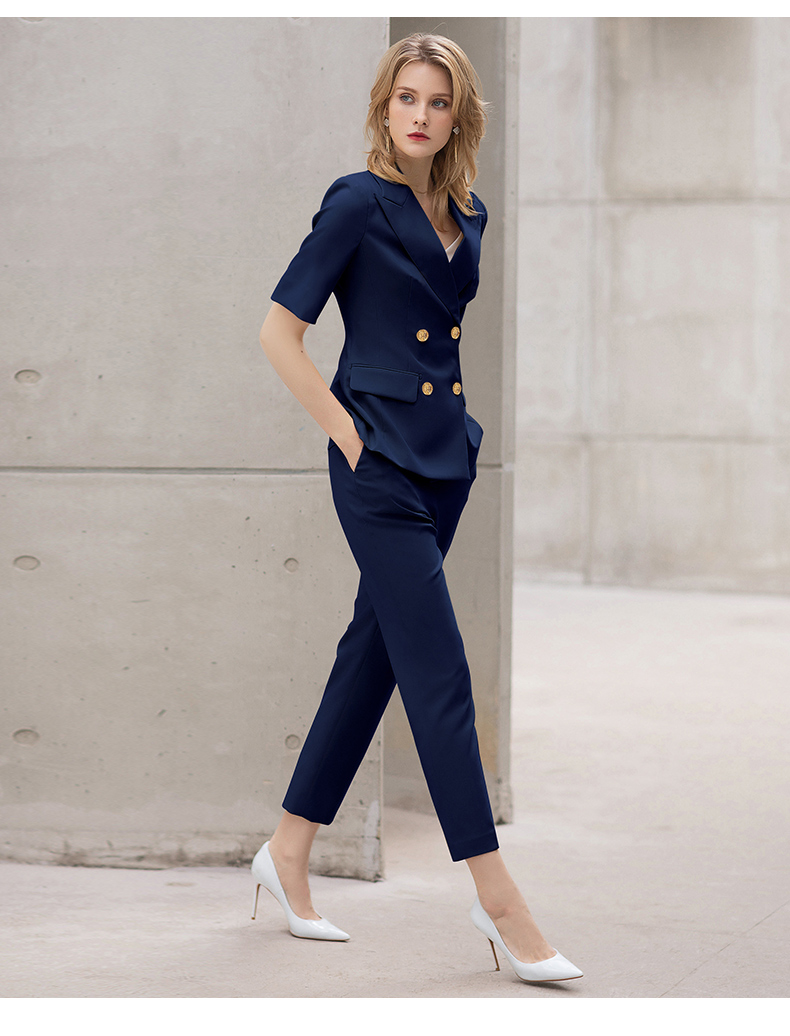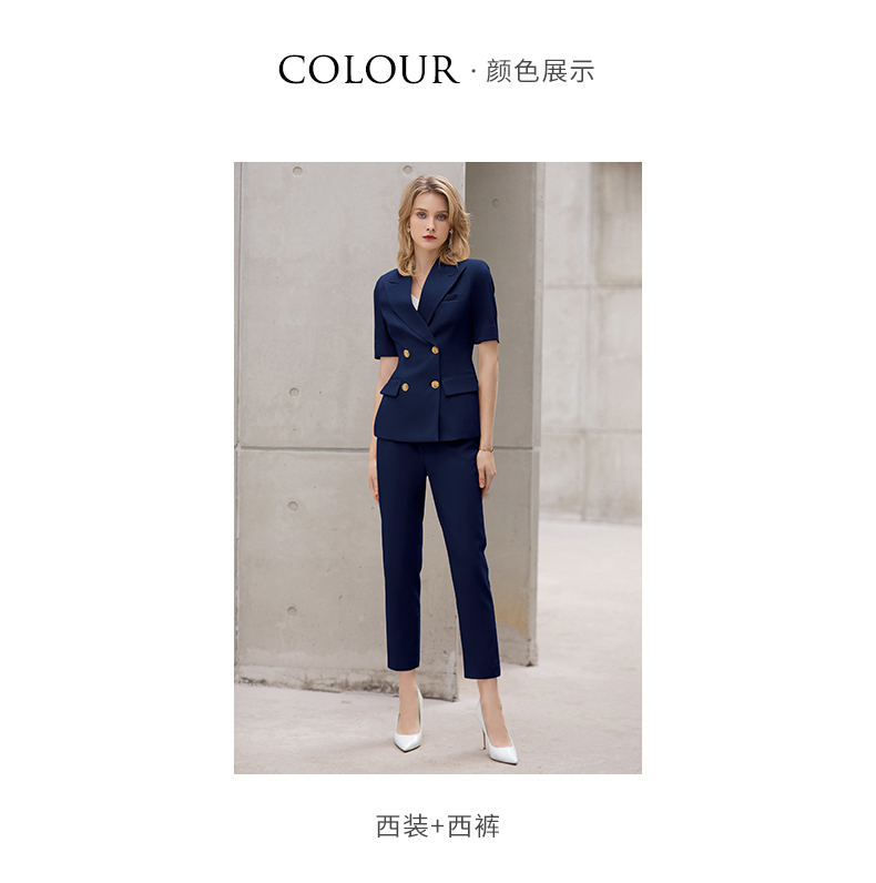 IWY/夏季优雅藏青色职业西服套裤女夏季新款双排扣修身ol西装套装CP13208