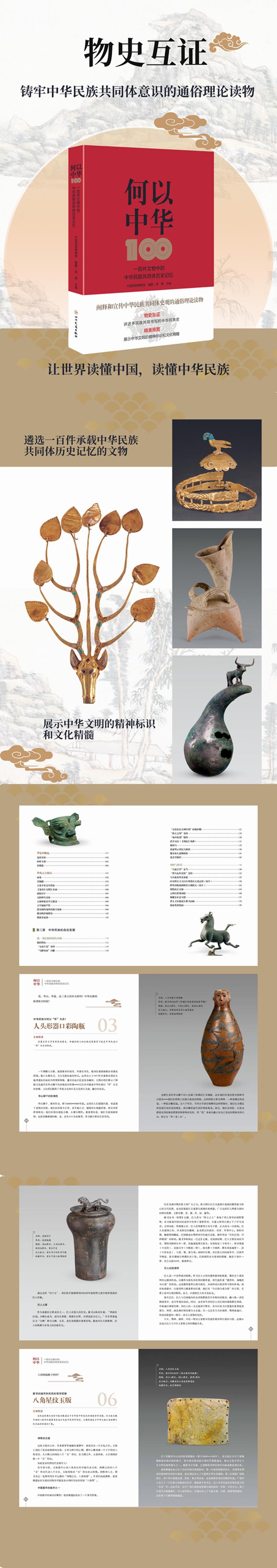 《何以中华:一百件文物中的中华民族共同体历史记忆》是首部铸牢中华民族共同体意识文物普及图书,是国家民族文字出版专项资金资助项目、四川省年度重点出版项目、四川出版发展公益基金项目,由四川民族出版社策划、中国民族博物馆编纂而成。 本书基于中国民族博物馆长期开展的重要学术工程“中华民族形成发展史实物表征体系研究”,深入挖掘各民族交往交流交融的历史事实、考古实物、文化遗存等历史文化资源,遴选一百件承载中华民族共同体历史记忆的文物,建构出“物”的谱系的中华民族形成发展史,有力地呈现中华民族共同体从自在走向自觉的历程和历史必然性,诠释中华民族共同体的历史内涵。 本书用物史互证的写作方式,讲述多民族共同书写的中华民族史;用超高清的精美原图,展示中华文明的精神标识和文化精髓;用有趣有味的语言表达,让世界读懂中国,读懂中华民族。