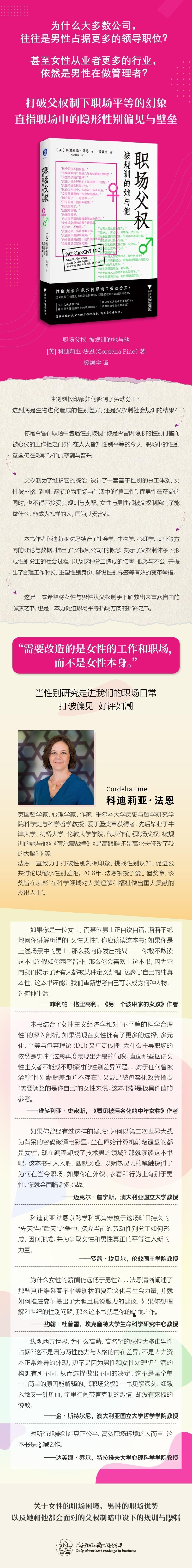 你是否曾在职场中遭遇性别歧视?你是否曾因隐形的性别门槛而被心仪的工作拒之门外?在人人皆知性别平等的今天,职场中的性别壁垒仍在影响我们的薪酬与晋升。父权制为了维护它的统治,设计了一套基于性别的分工体系,女性被排挤、剥削,逐渐沦为职场与生活中的“第二性”,而男性在获益的同时,也不得不接受其规训与支配。女性与男性都被父权制了能做什么,能成为怎样的人,同为其受害者。本书作者科迪莉亚·法恩结合了社会学、生物学、心理学、商业等方向的理论与数据,提出了“父权制公司”的概念,揭示了父权制体系下形成性别分工的社会过程,以及这种分工造成的伤害、低效与不公,并提出了合理工作时长、重塑性别身份、警惕性别标签等有效的变革举措。这是一本希望将女性与男性从父权制手下解救出来重获自由的解放之书,也是一本为促进职场平等指明方向的指路之书。