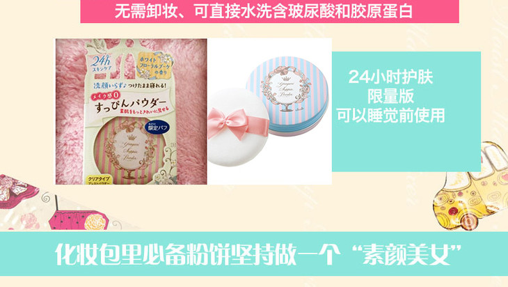 推荐理由: 它不是简单意义上的粉饼,是出浴后可直接涂抹的护肤品,在国内爆火后被称为“晚安粉”可治男神不定时“袭击”哦~上妆轻薄自然,雾面的效果,粉质很细很细,细到几乎感觉不到存在。在让肌肤透白的同时还有养护肌肤的作用,含有玻尿酸、胶原蛋白成分,可以保湿滋润,增加肌肤透明感和光滑度。扑粉后可直接睡觉的,无需卸妆,这不是我们普通概念中的粉饼,一晚上的滋润保湿,一边睡觉一边护肤。自带美颜,持久出浴光环,带“妆”即睡 |