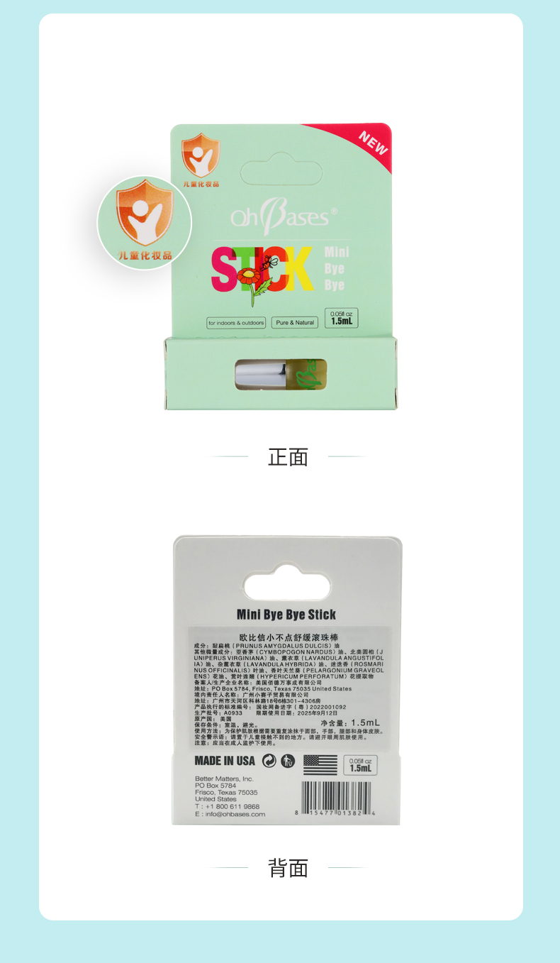 【儿童驱蚊止痒小滚珠 】美国OhBases欧比信小不点舒缓滚珠棒1.5ml 儿童驱蚊止痒小滚珠小绿珠走珠防蚊叮咬 送可爱小猴子挂件