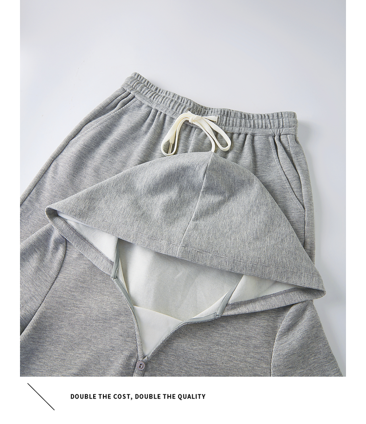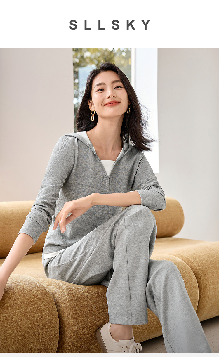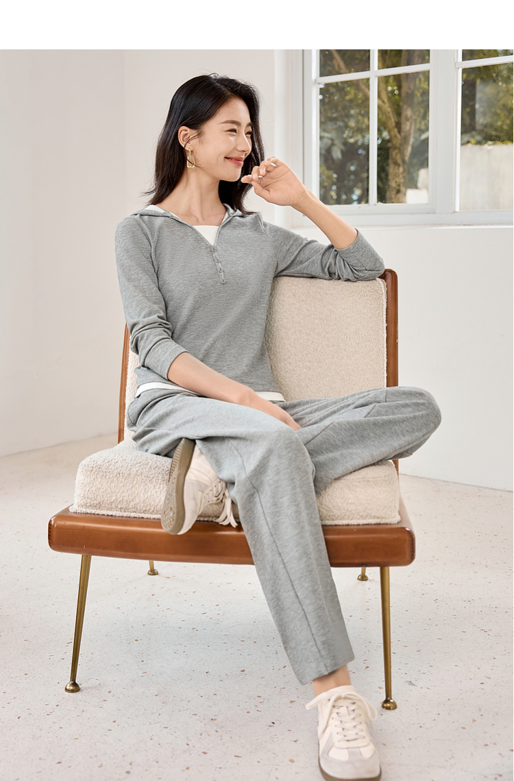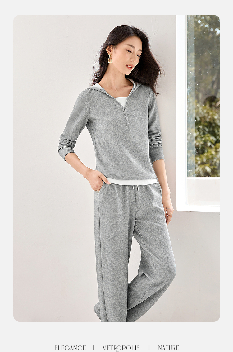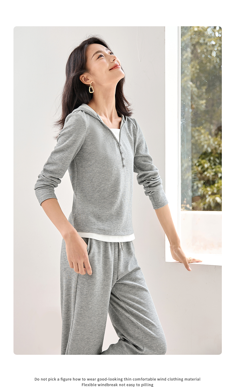 【年终特卖】熙世界休闲运动风套装女春秋灰色套头连帽针织卫衣阔腿裤两件套