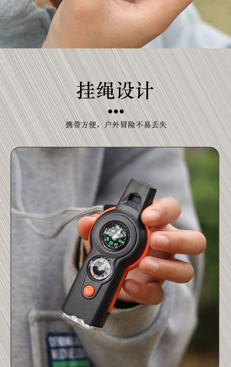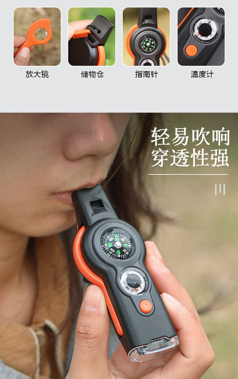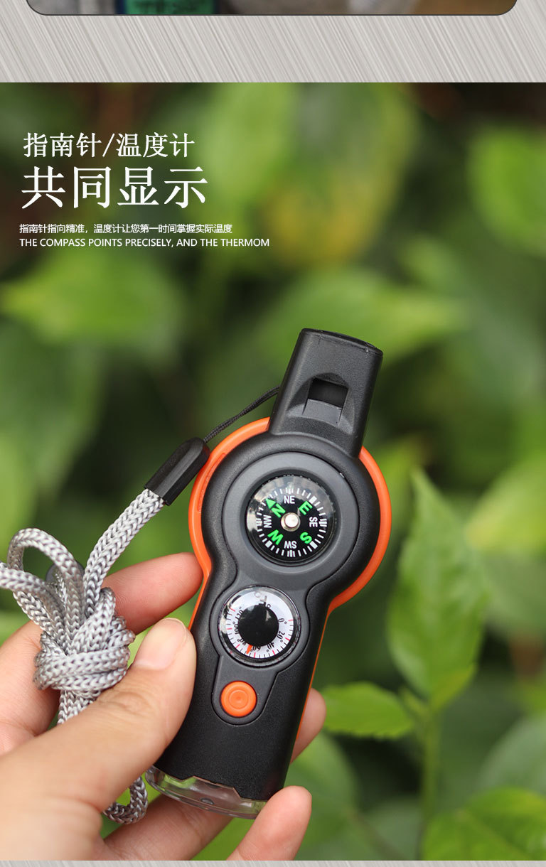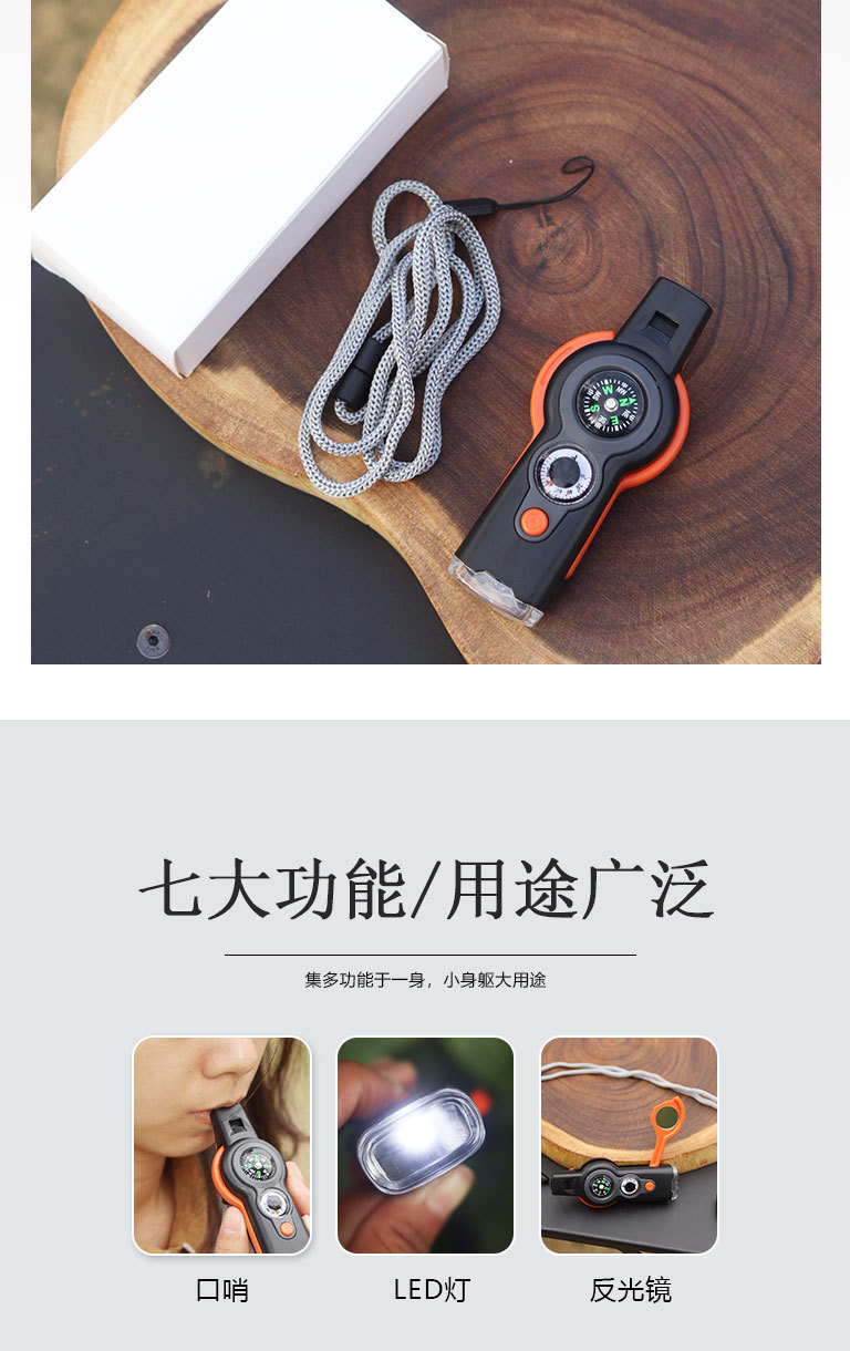 【户外爆款,轻巧必备】七合一多功能口哨,冒险利器。指南针、温度计、反光镜、LED灯,一应俱全,轻巧便携。户外冒险;探险路上的得力助手!
