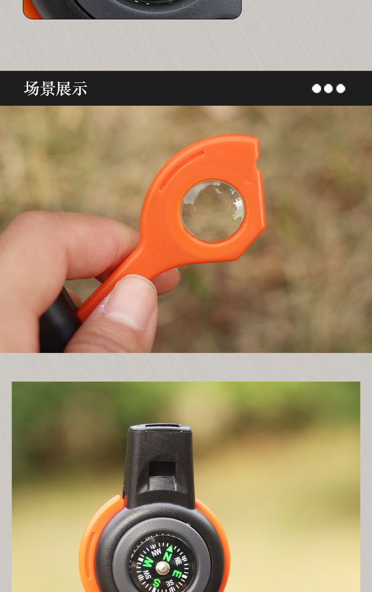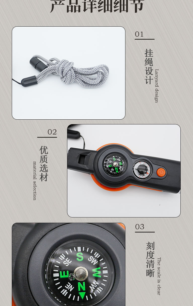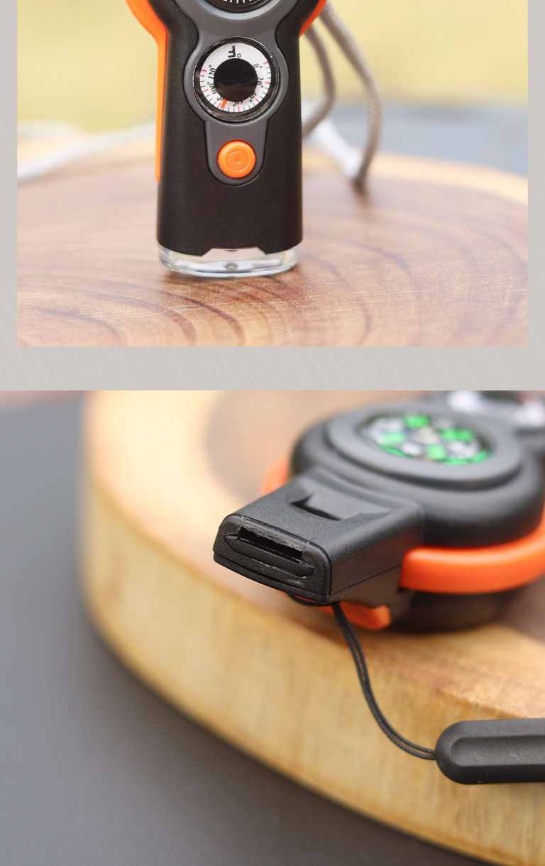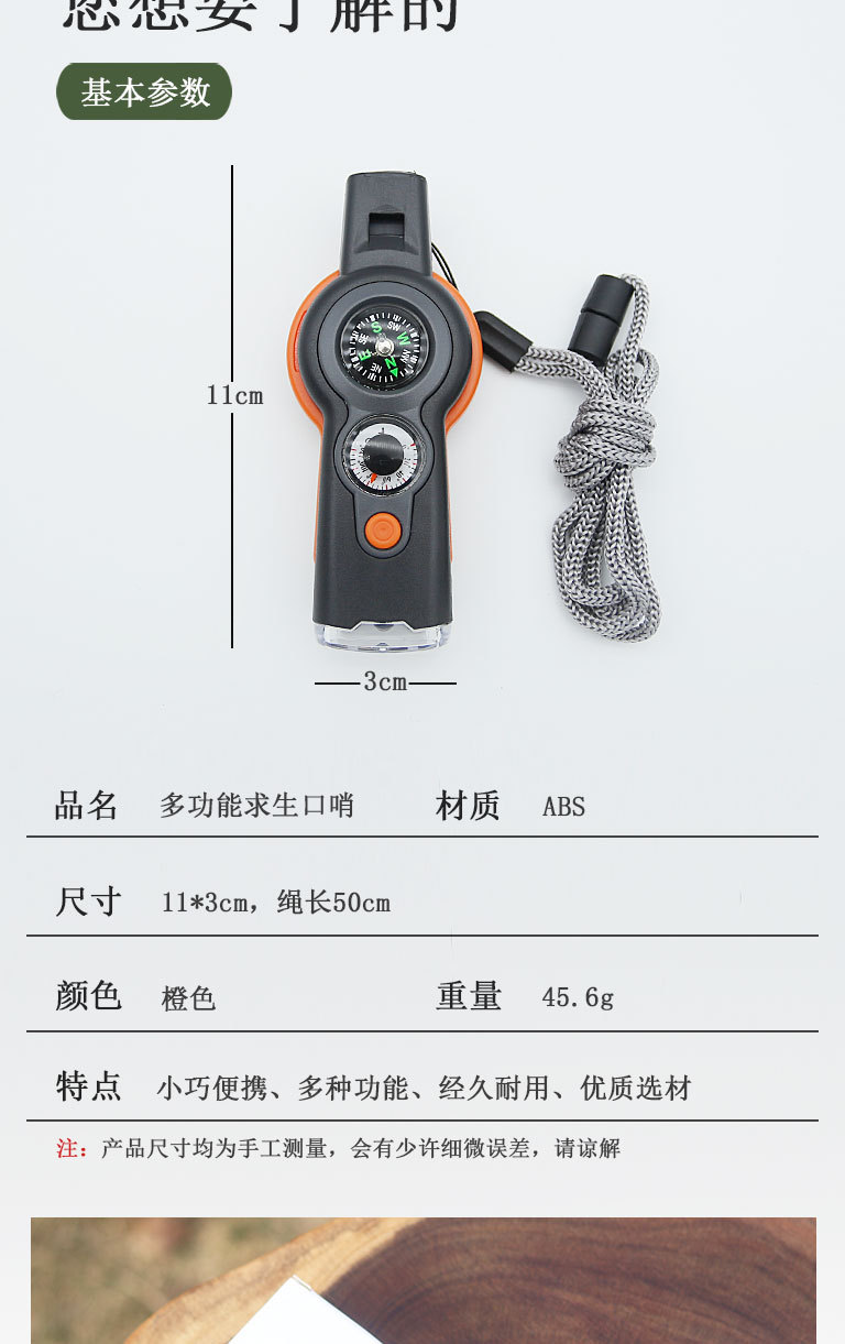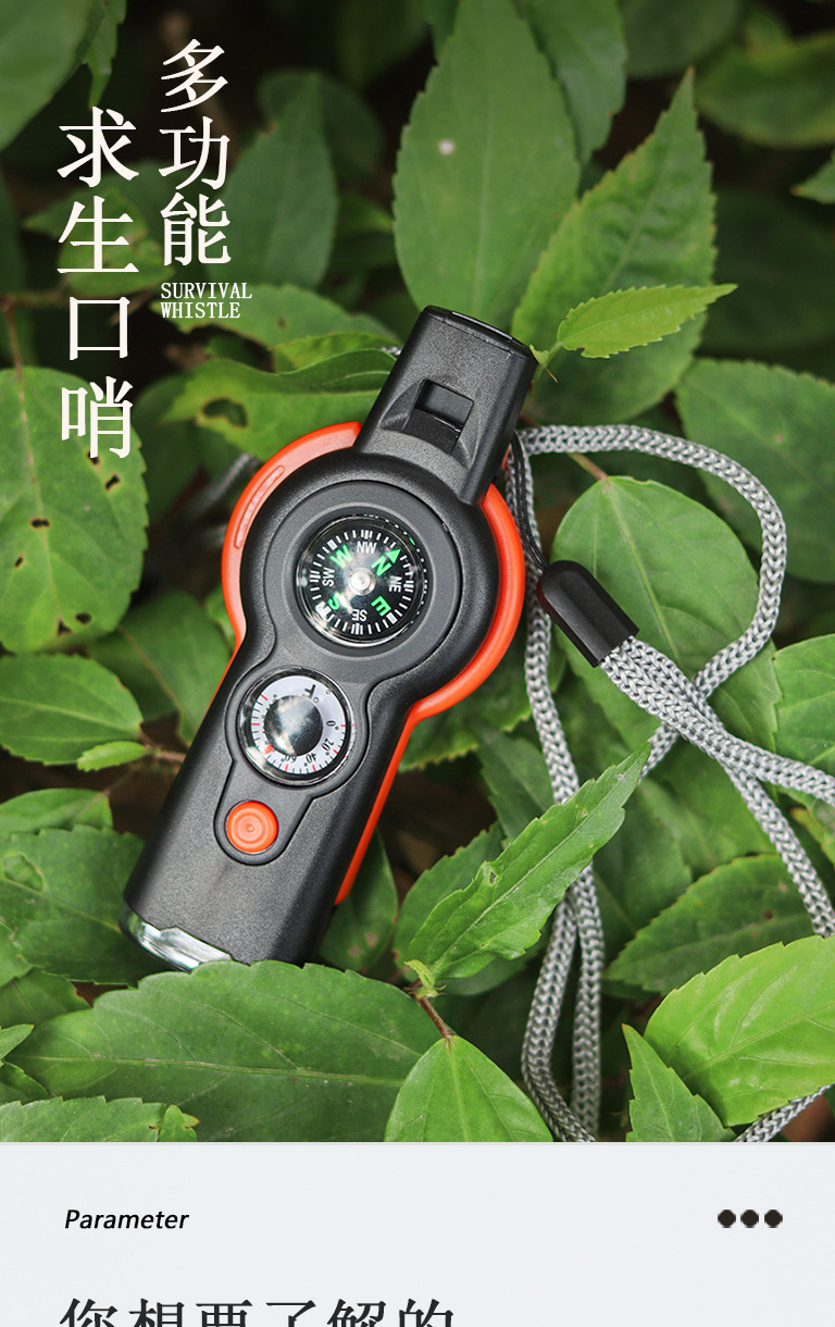【户外爆款,轻巧必备】七合一多功能口哨,冒险利器。指南针、温度计、反光镜、LED灯,一应俱全,轻巧便携。户外冒险;探险路上的得力助手!