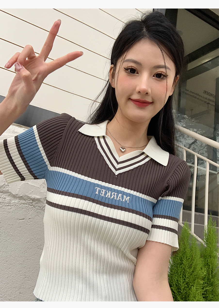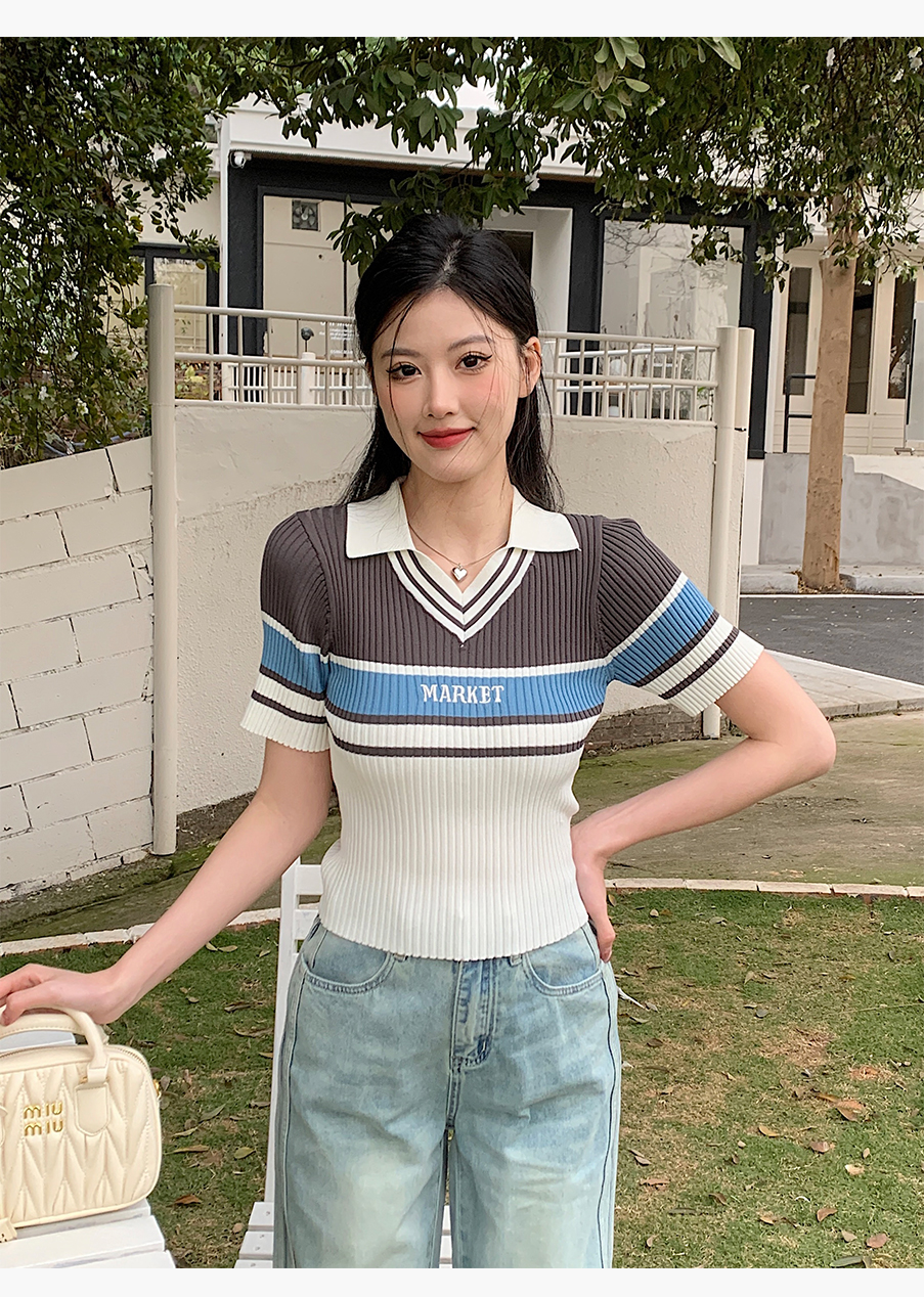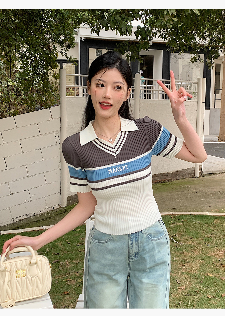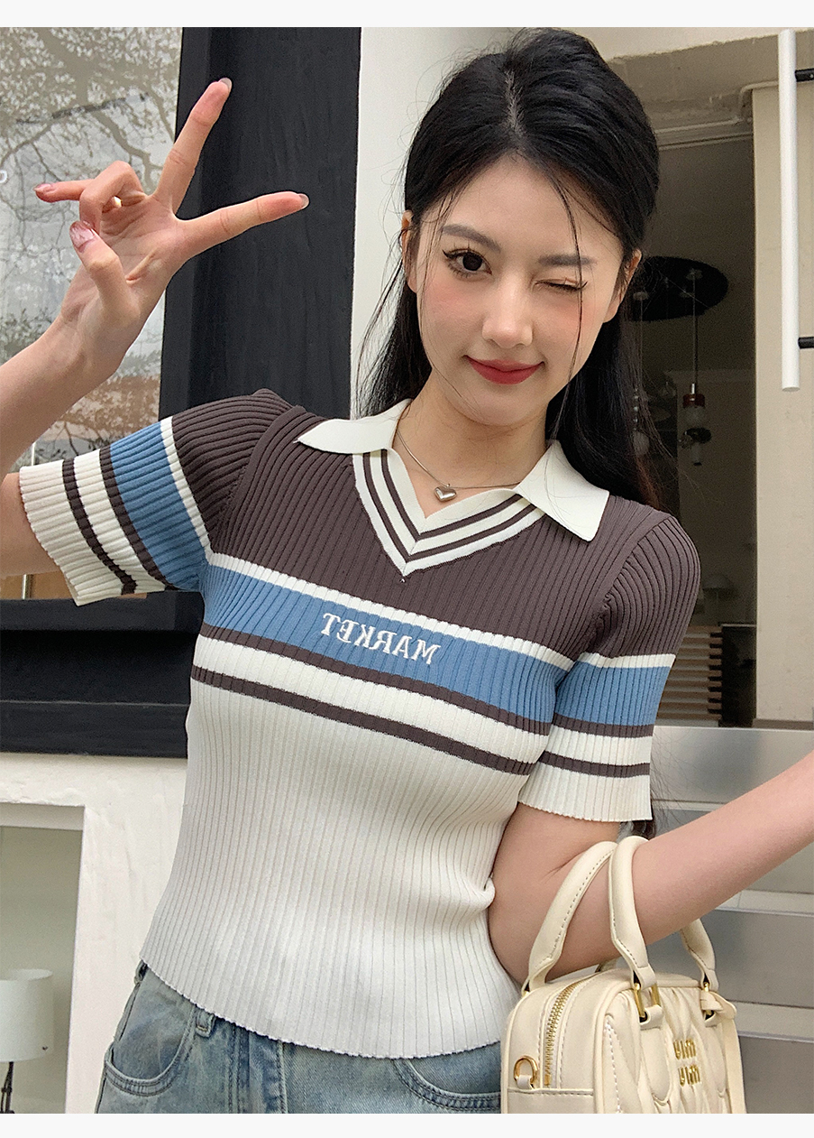 P&X设计师女装 休闲时尚修身条纹翻领短款针织衫824231258 灰/杏