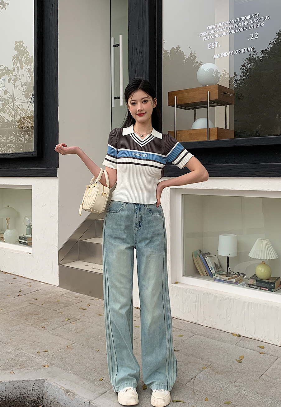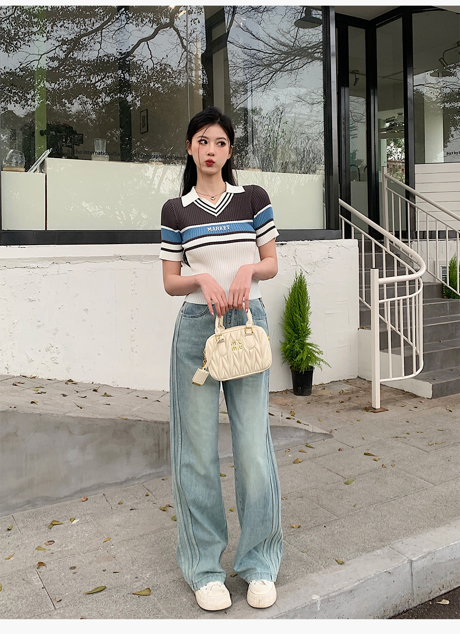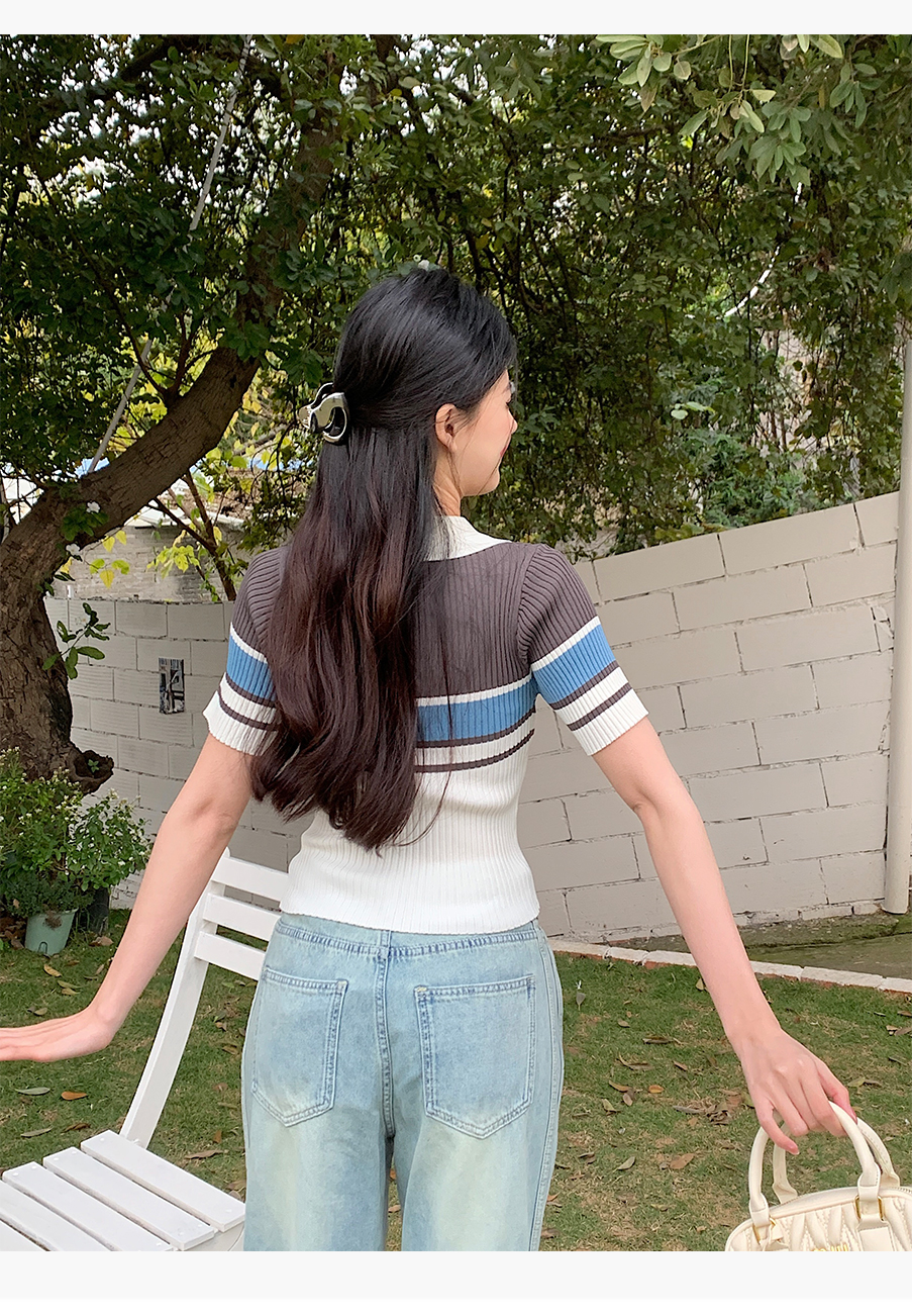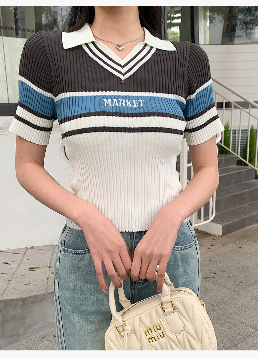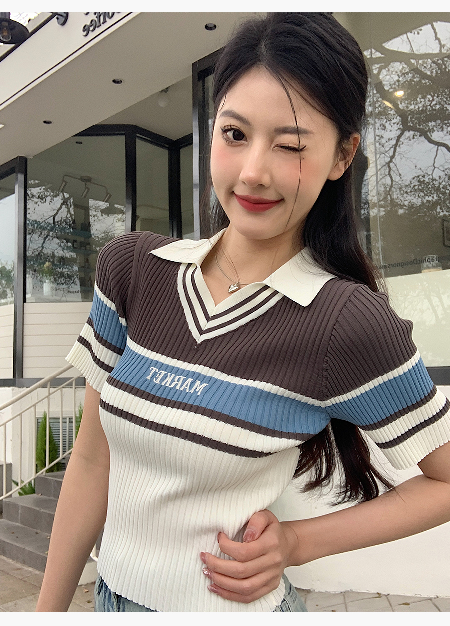 P&X设计师女装 休闲时尚修身条纹翻领短款针织衫824231258 灰/杏