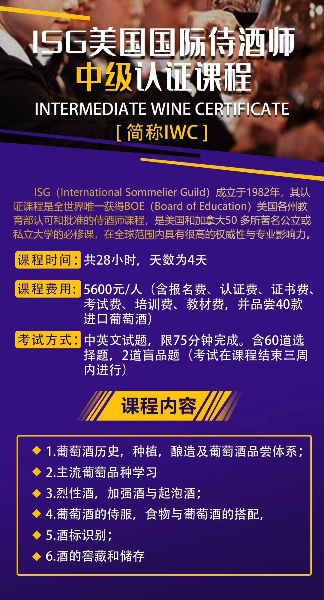 ISG国际侍酒师中级认证报名(含报名费、认证费、证书费、考试费、培训费、教材费,并品尝40款进口葡萄酒)