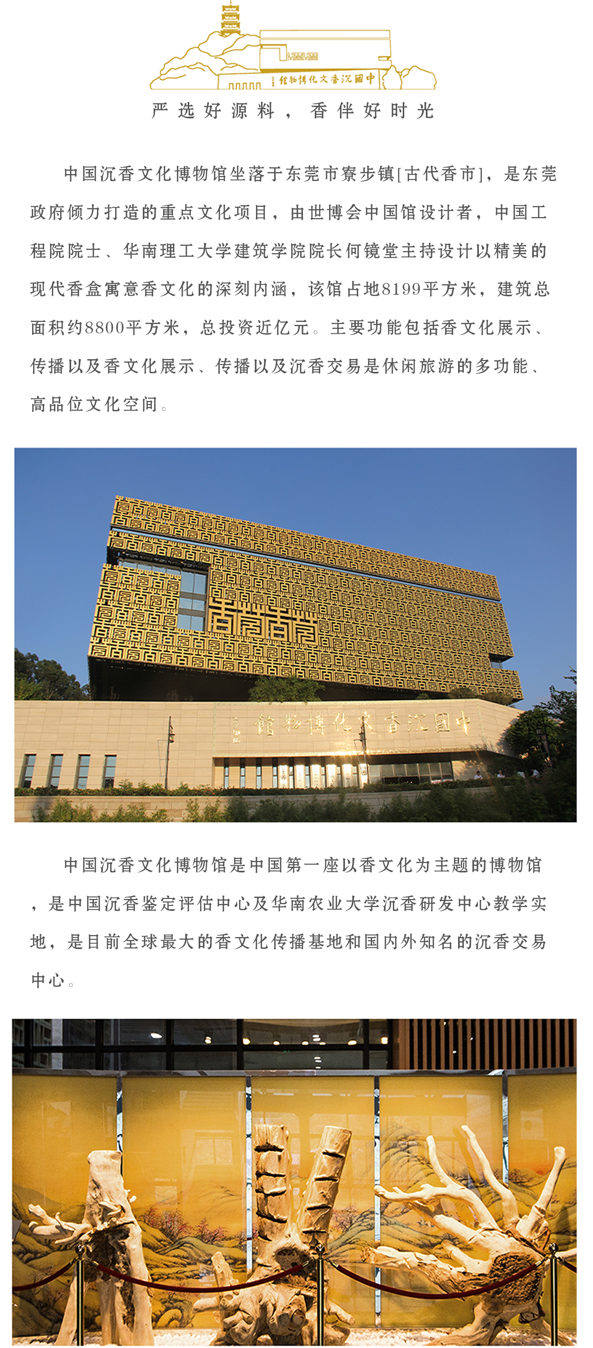 中国沉香文化博物馆坐落于古代[香市]东莞市寮步镇,是东莞政府倾力打造的重点文化项目,由世博会中国馆设计者,中国工程院院士、华南理工大学建筑学院院长何镜堂主持设计,以精美的现代[香盒]寓意香文化的深刻内