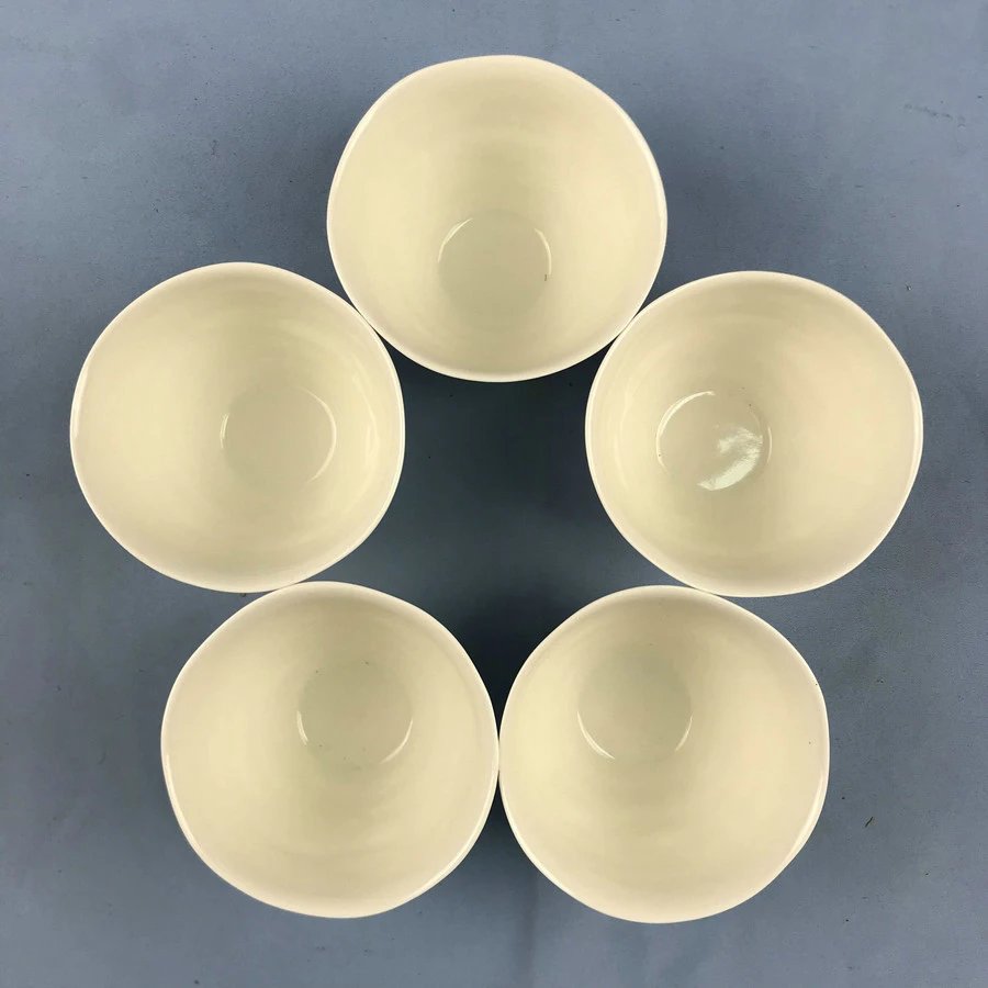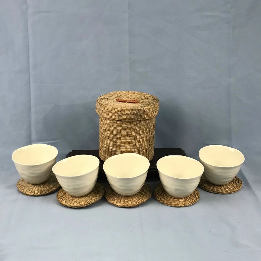 日本肥前风趣手工白瓷茶碗 5枚装含草编盖桶与茶托 原盒保留