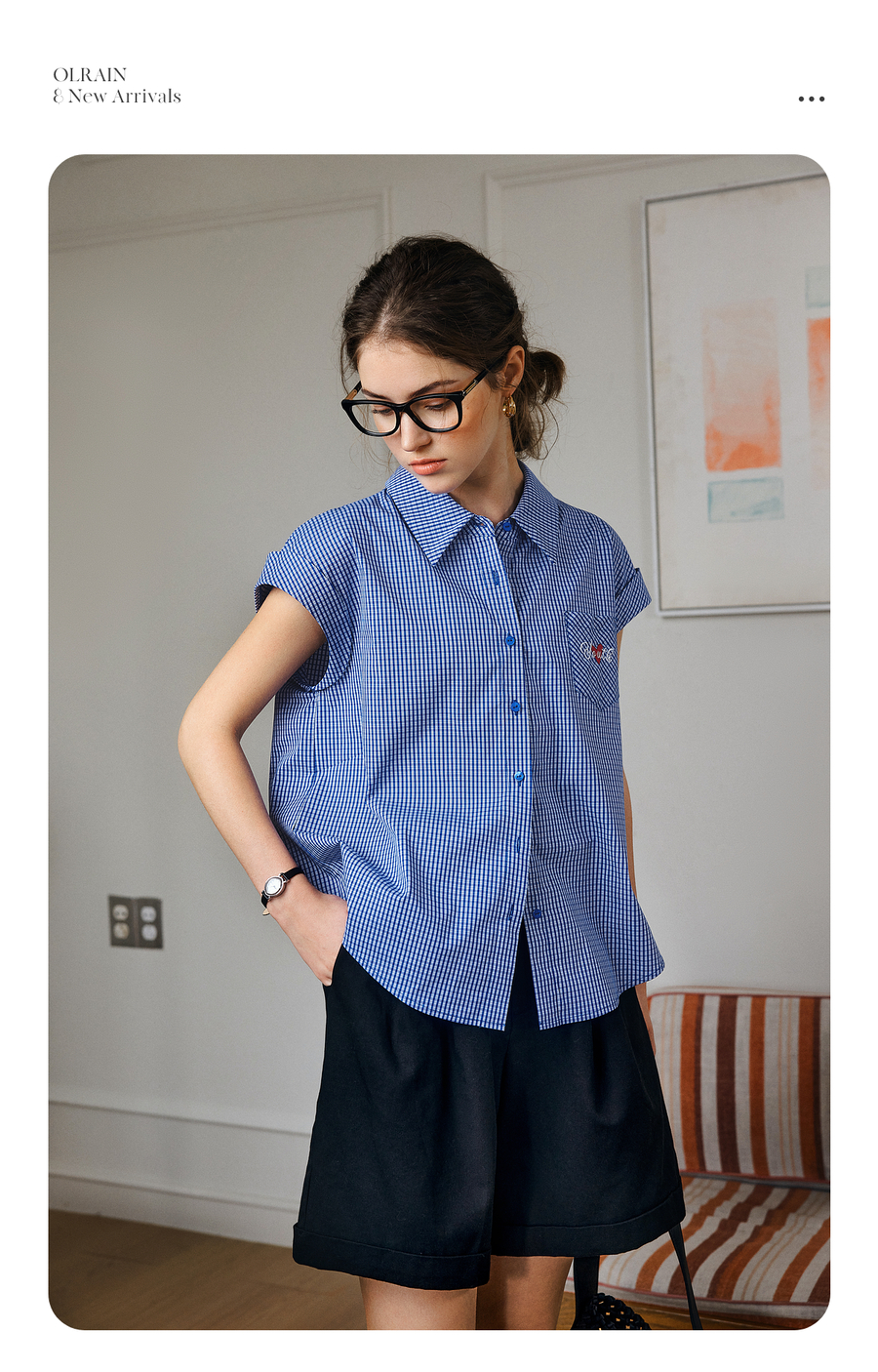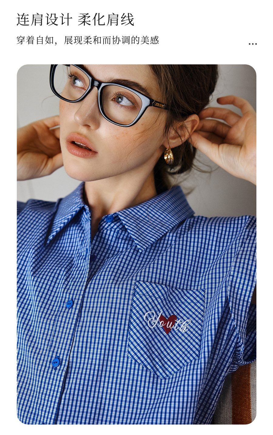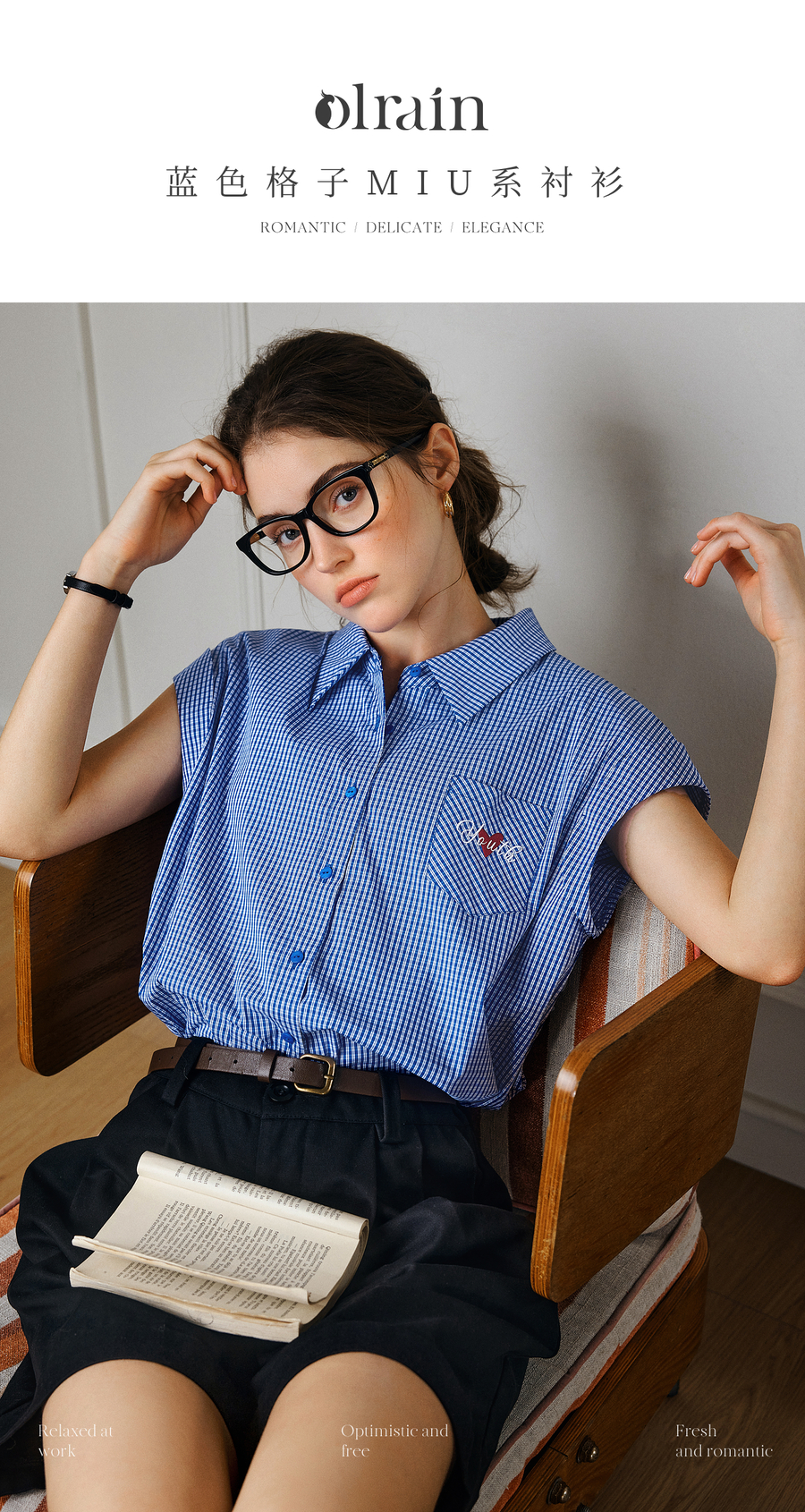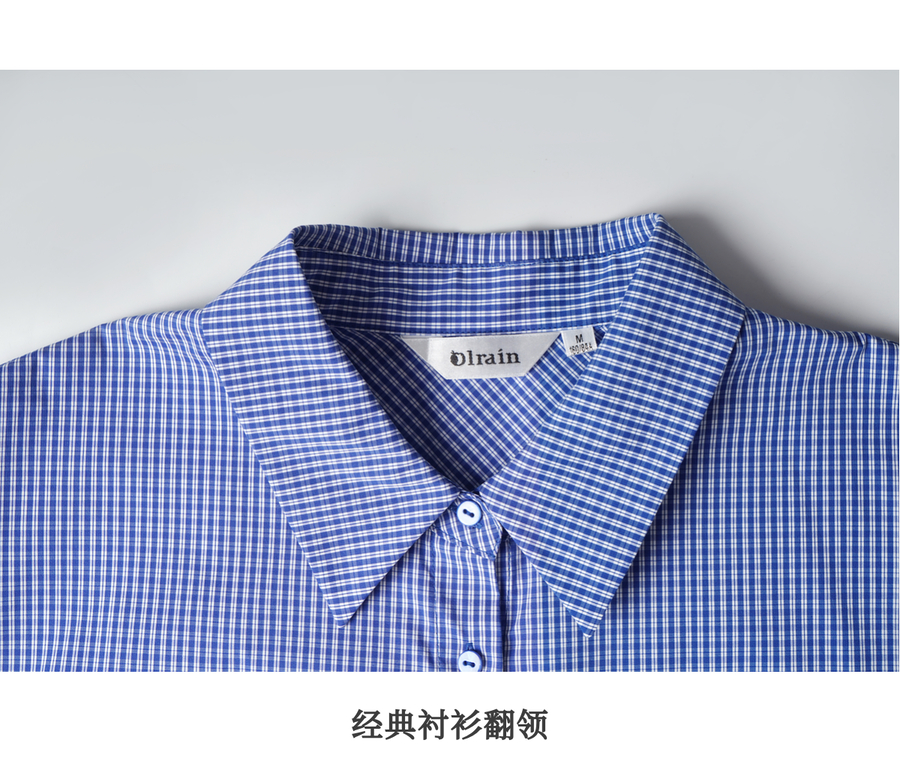 OLrain欧芮儿蓝色格子衬衫女夏季2025年新款通勤高级感连肩衬衣