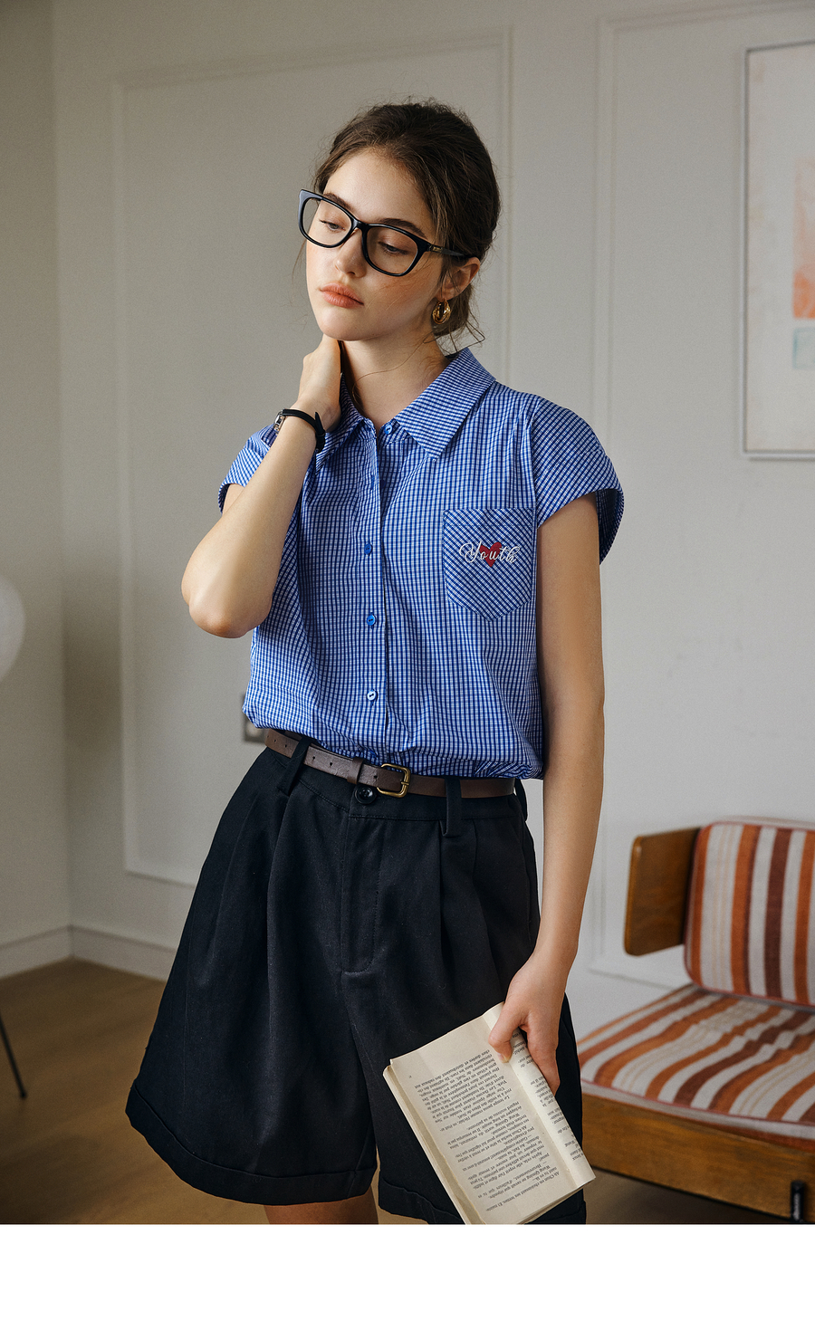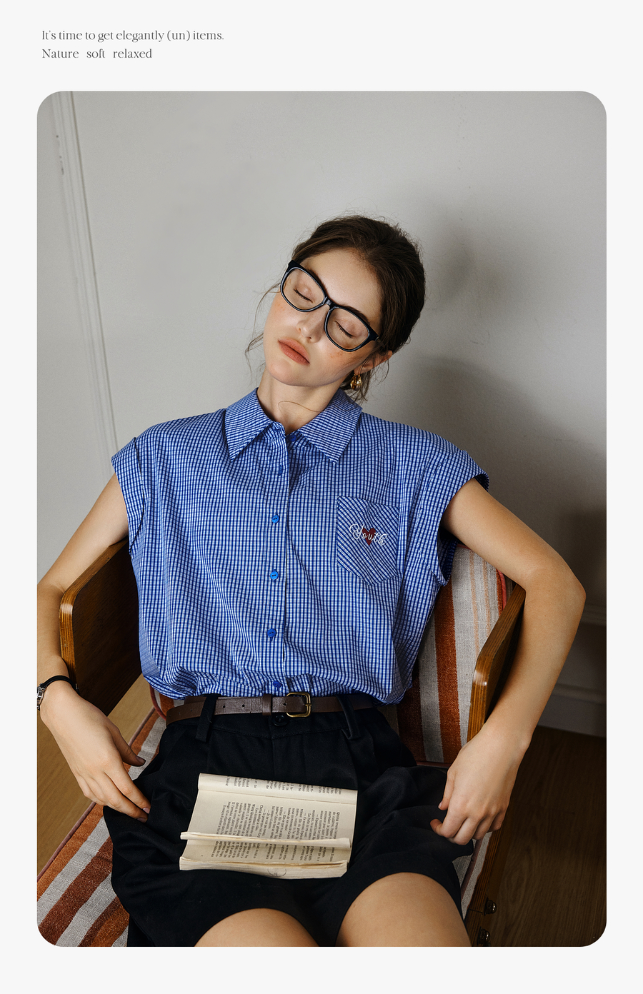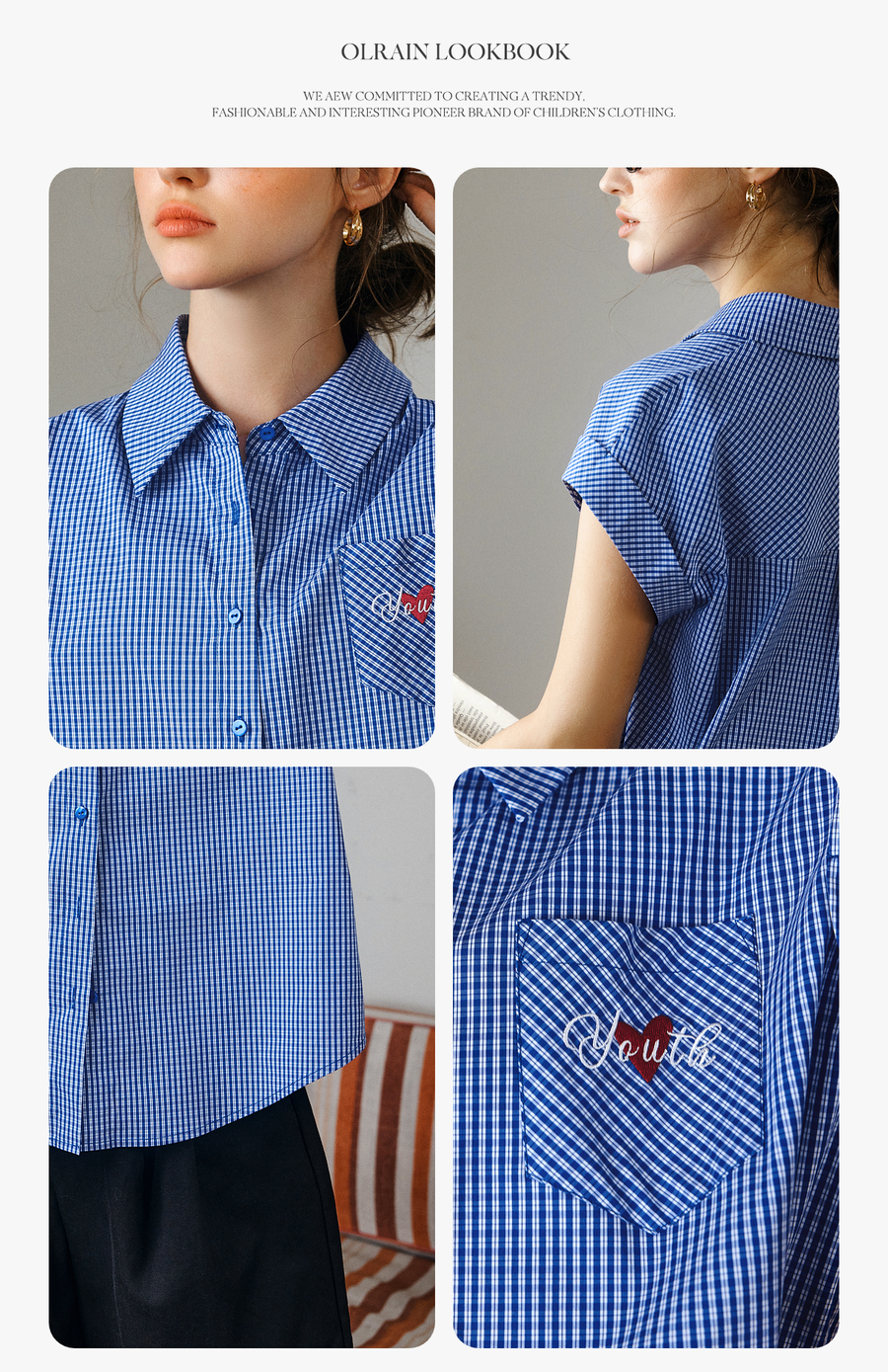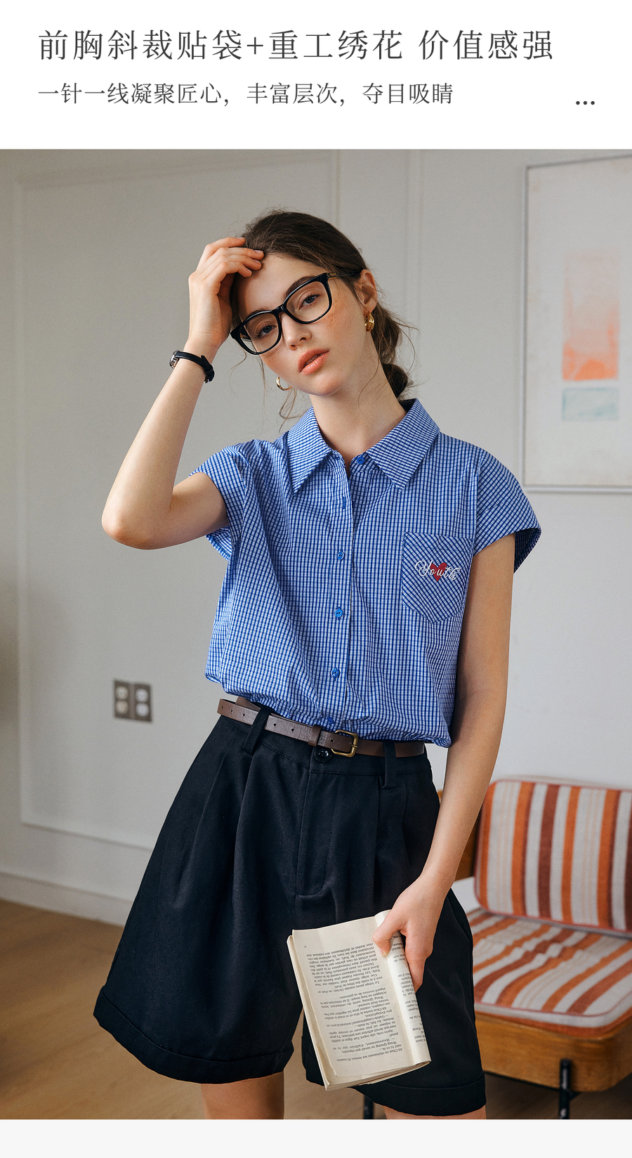 OLrain欧芮儿蓝色格子衬衫女夏季2025年新款通勤高级感连肩衬衣