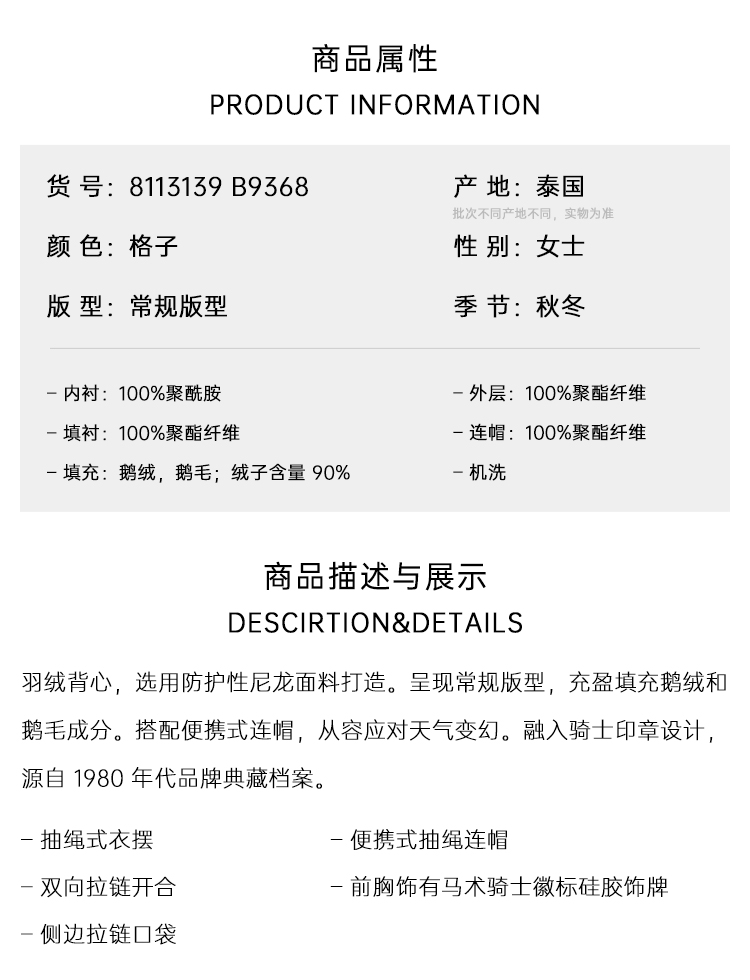 BURBERRY 巴宝莉 女士格纹羽绒背心马甲 格子 8113139 B9368