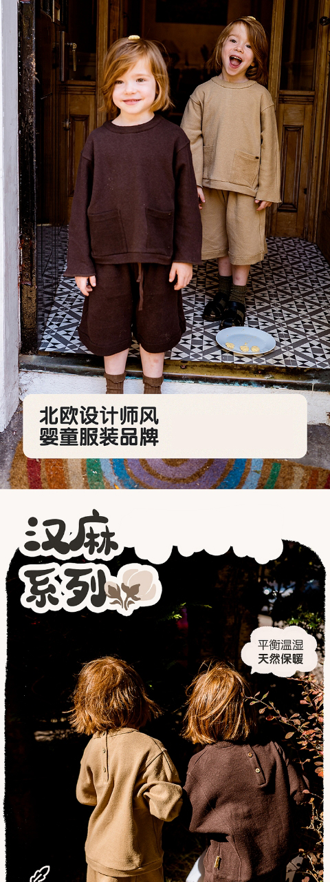 【云优选】lelejove北欧风秋季圆领长袖卫衣男女宝宝穿纯色短裤宽松口袋套装
