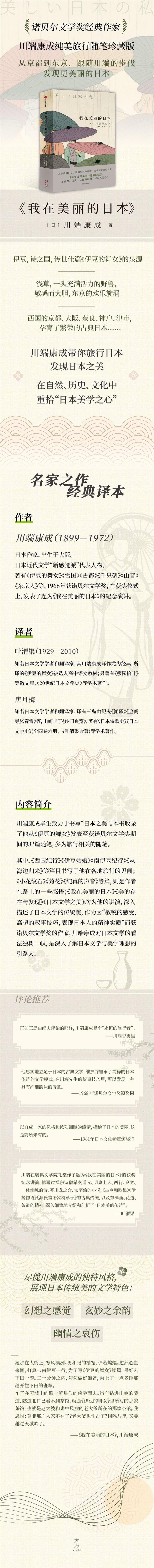 本书为日本文学大师川端康成的随笔集,收录了从《伊豆的舞女》发表至获诺贝尔文学奖期间的30余篇随笔。书名《我在美丽的日本》取自其中之一,是川端康成获得诺贝尔奖时发表的纪念演讲。川端康成毕生致力于书写“日本之美”,《西国纪行》《伊豆姑娘》《南伊豆纪行》《从海边归来》等篇目书写了他在各地旅行的见闻;《小花纹石》《菊花》《纯真的声音》等篇,则是作者在日常生活中一些感悟的高度凝练。《日本文学之美》属文学评论作品,作为因“敏锐的感受,高超的叙事技巧,表现日本人的精神实质”而获诺贝尔文学奖的作家,川端康成在这一领域的造诣十分出众,他对日本文学的看法独树一帜,是深入了解日本文学与美学的引路人。