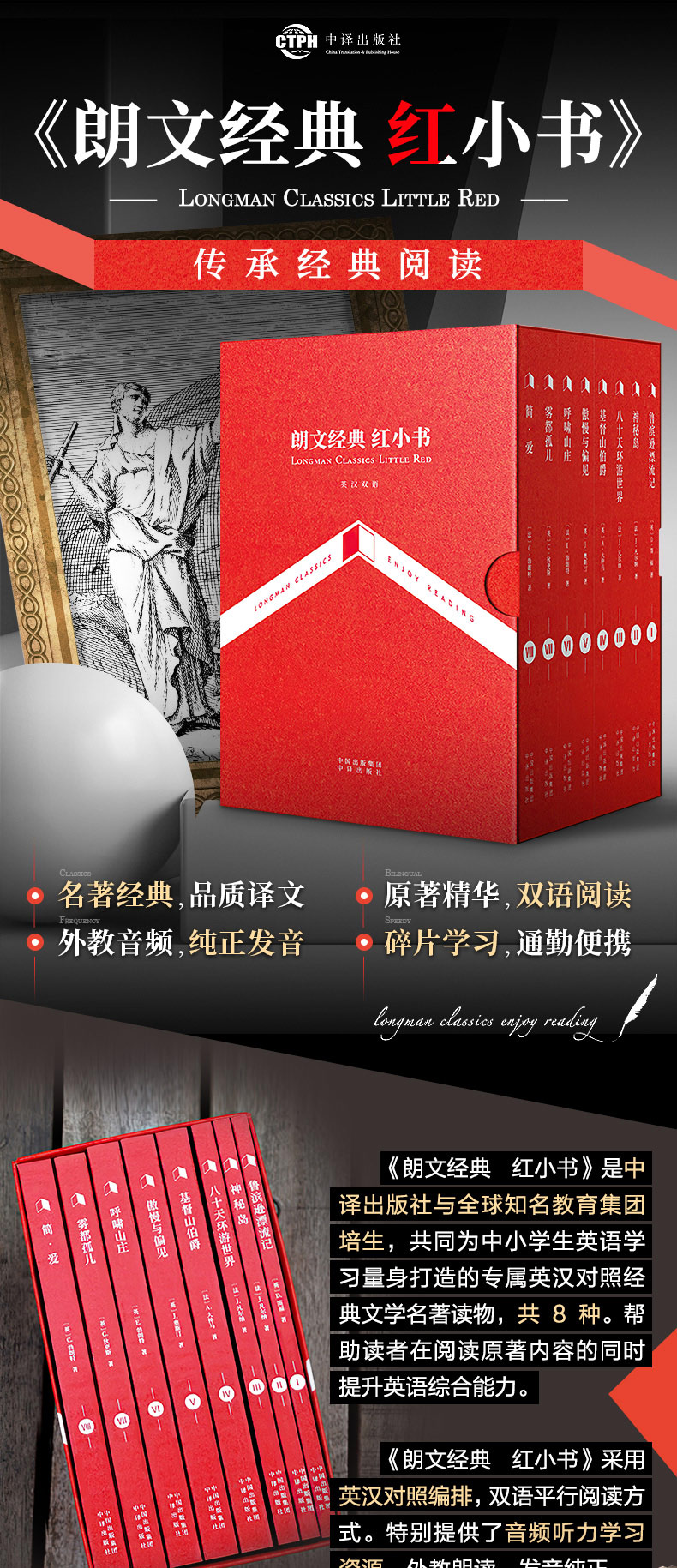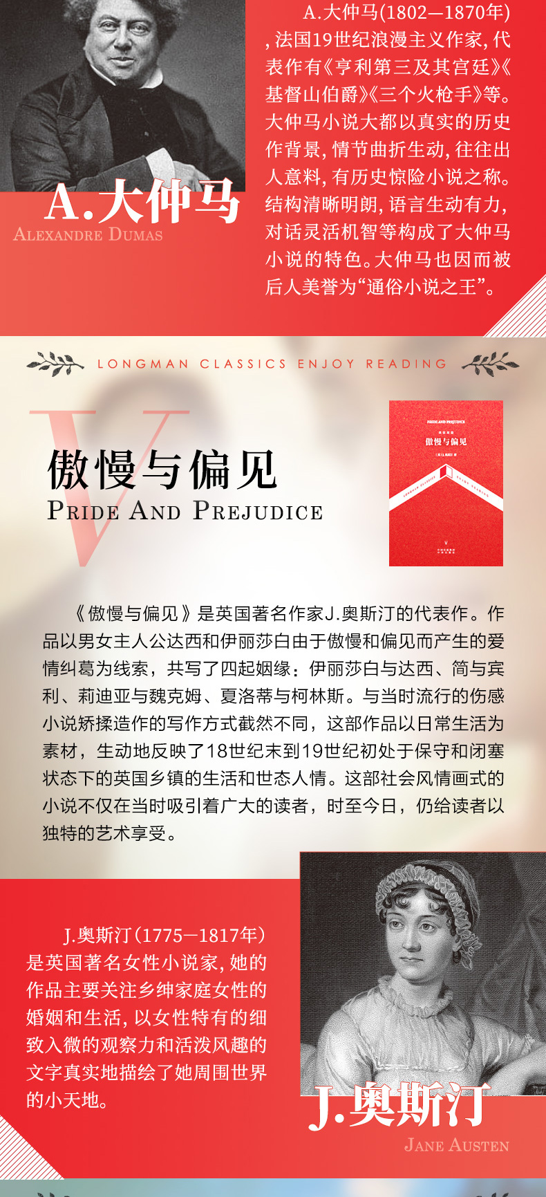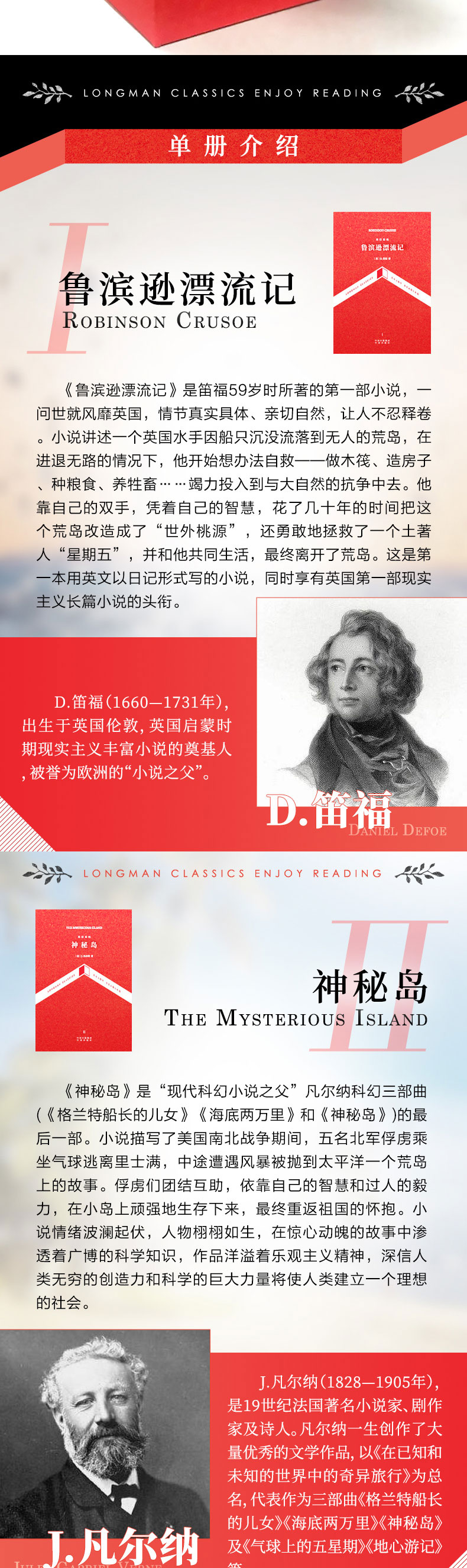 《傲慢与偏见》是英国著 名作家J.奥斯汀的代表作。作品以男女主人公达西和伊丽莎白由于傲慢和偏见而产生的爱情纠葛为线索,共写了四起姻缘:伊丽莎白与达西、简与宾利、莉迪亚与魏姆、夏洛蒂与柯林斯。与当时流行的伤感小说矫揉造作的写作方式截然不同,这部作品以日常生活为素材,生动地反映了18世纪末到19世纪初处于保守和闭塞状态下的英国乡镇的生活和世态人情。这部社会风情画式的小说不仅在当时吸引着广大的读者,时至今日,仍给读者以独特的艺术享受。//《鲁滨逊漂流记》是笛福59岁时所著的第 一部小说,一问世就风靡英国,情节真实具体、亲切自然,让人不忍释卷。小说讲述一个英国水手因船只沉没流落到无人的荒岛,在进退无路的情况下,他开始想办法自救——做木筏、造房子、种粮食、养牲畜……竭力投入到与大自然的抗争中去。他靠自己的双手,凭着自己的智慧,花了几十年的时间把这个荒岛改造成了“世外桃源”,还勇敢地拯救了一个土著人“......