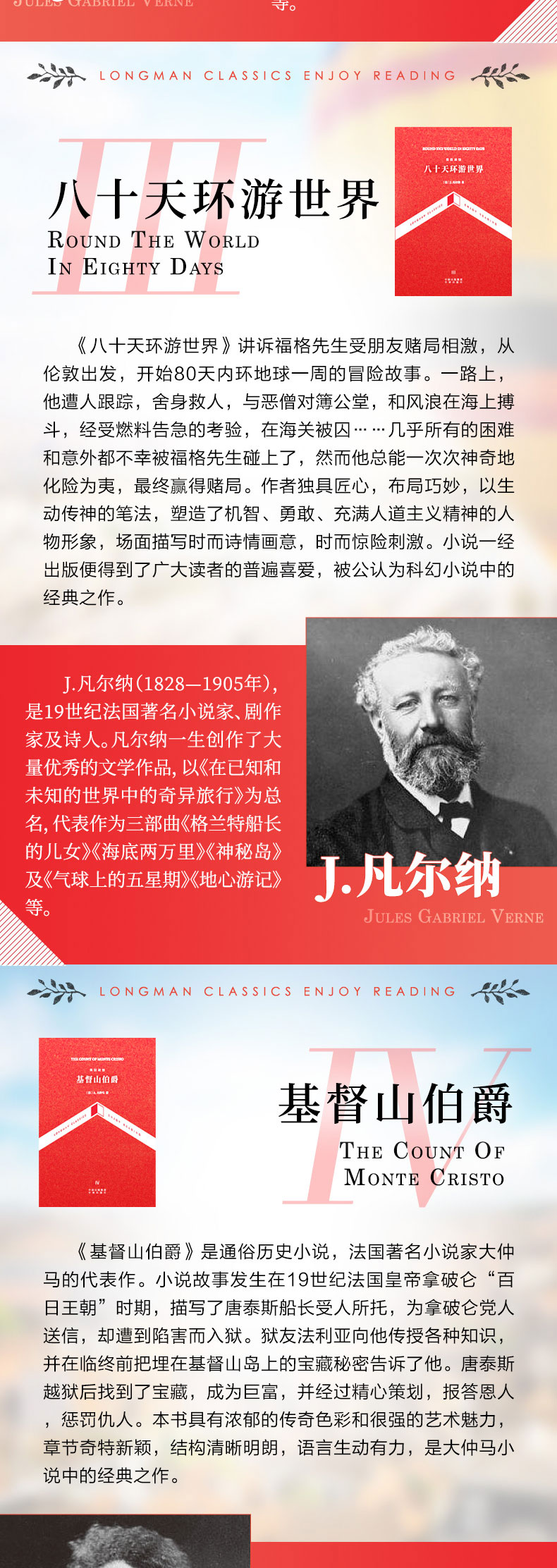 D.笛福(1660—1731年),出生于英国伦敦,英国启蒙时期现实主义丰富小说的奠基人,被誉为欧洲的“小说之父”。/J.凡尔纳(1828—1905年),是19世纪法国著 名小说家、剧作家及诗人。凡尔纳一生创作了大量优 秀的文学作品,以《在已知和未知的世界中的奇异旅行》为总名,代表作为三部曲《格兰特船长的儿女》《海底两万里》《神秘岛》及《气球上的五星期》《地心游记》等。/A.大仲马(1802—1870年),法国19世纪浪漫主义作家,代表作有《亨利第三及其宫廷》《基督山伯爵》《三个火枪手》等。大仲马小说大都以真实的历史作背景,情节曲折生动,往往出人意料,有历史惊险小说之称。结构清晰明朗,语言生动有......