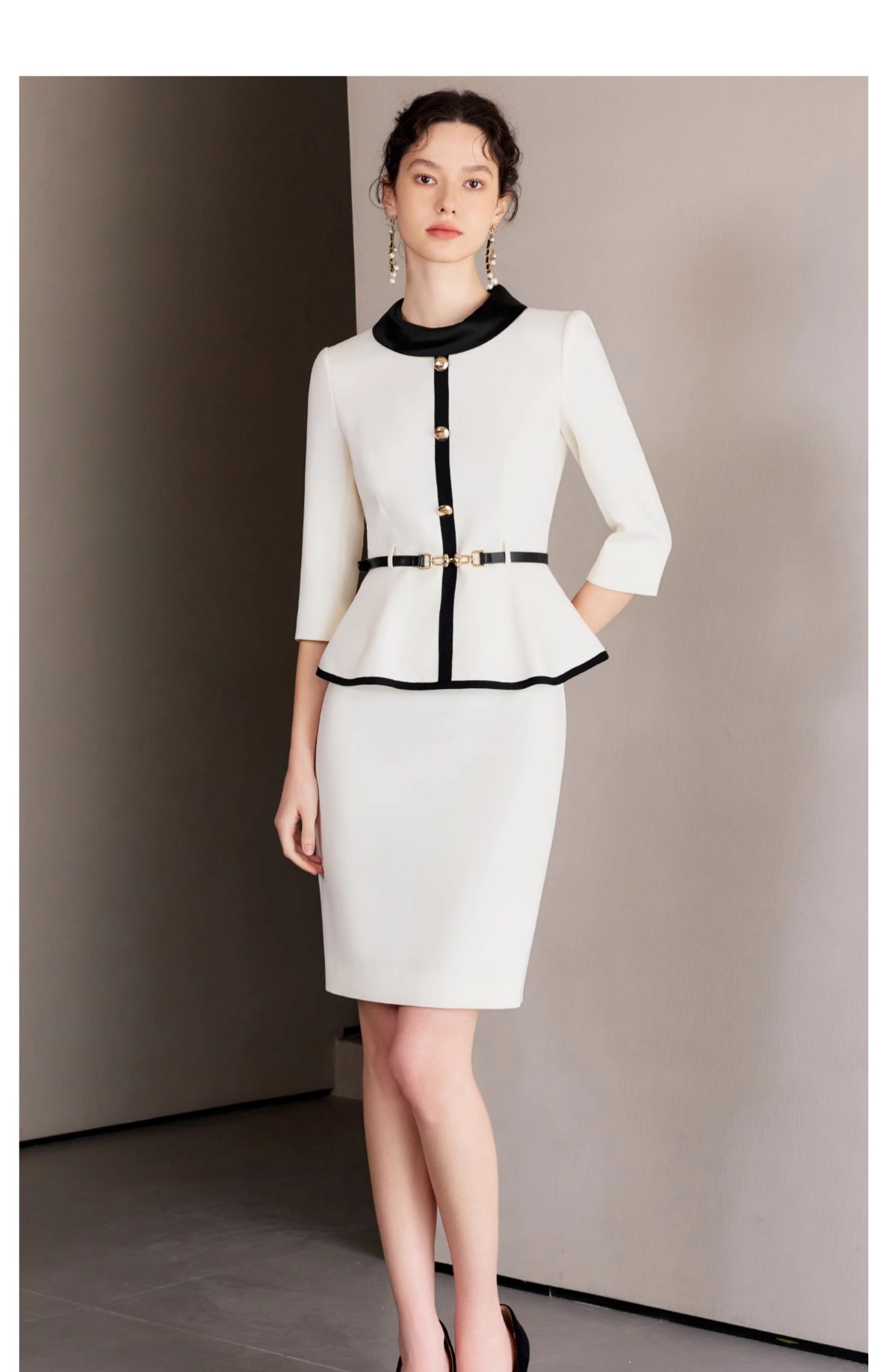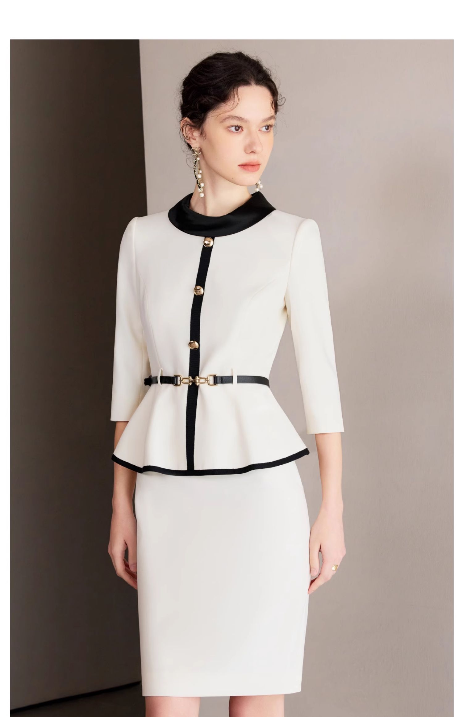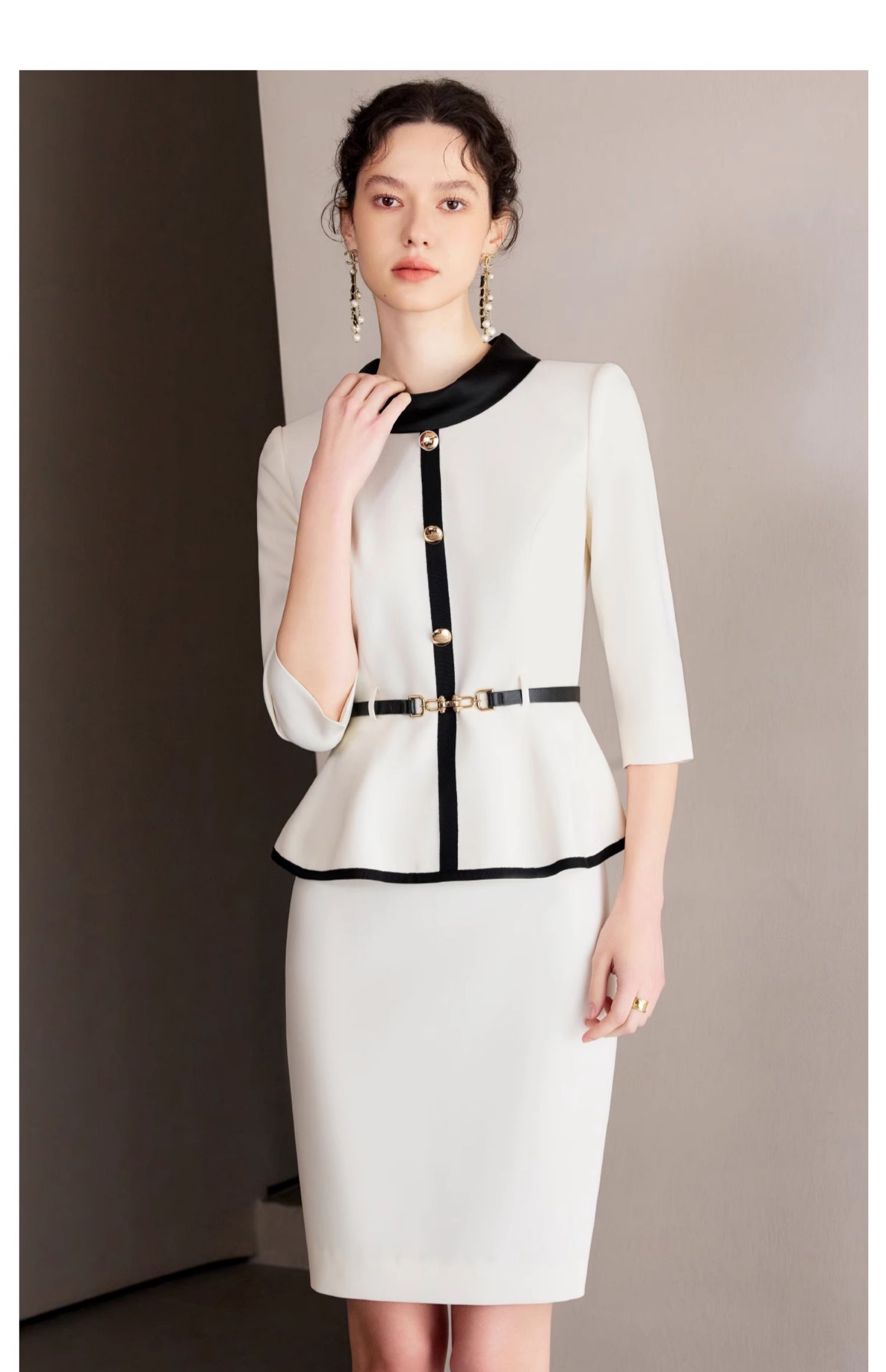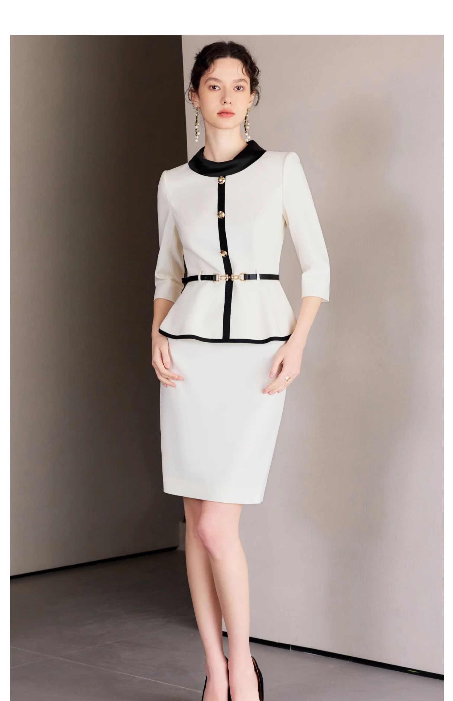 IWY/黑白拼接七分袖白色连衣裙女设计感假两件医美职业裙装正装Q1273