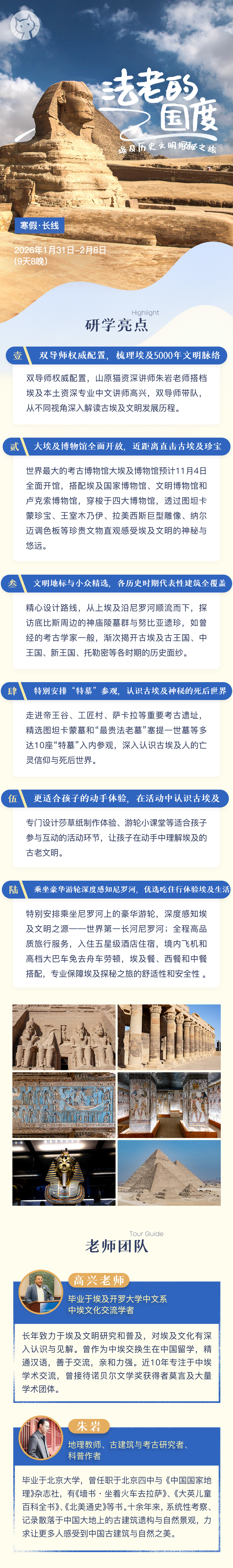 【法老的国度·埃及历史文明探秘之旅】全程深度探访埃及3大城市、4家博物馆、5座金字塔、8处神庙、17个墓葬与无数出土文物珍品,与大家一同回溯古埃及文明历程。