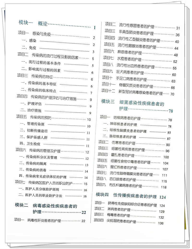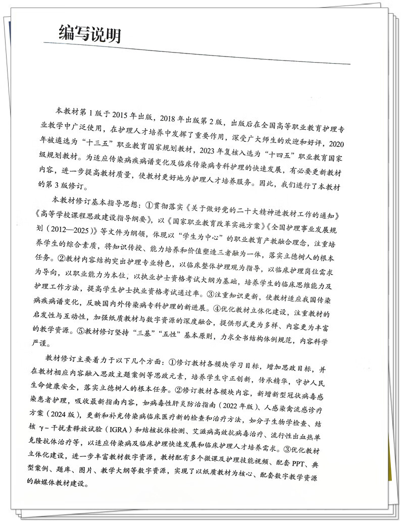 本教材主要包括传染病总论、病毒性疾病感染患者护理、细菌感染疾病患者的护理、性传播疾病患者的护理、钩端螺旋体病患者的护理等主要内容,主要任务是通过课程教学使学生了解传染病的病原学及流行病学特点,掌握传染病的消毒、隔离技术,正确评估传染病患者的身心状况,提出护理问题并制订相应的护理计划;同时学生具备对常见传染病患者的护理能力,具备传染病专科实践操作能力,逐步培养和锻炼分析问题、解决问题的能力,为学生从事临床传染病专科护理奠定坚实的基础。