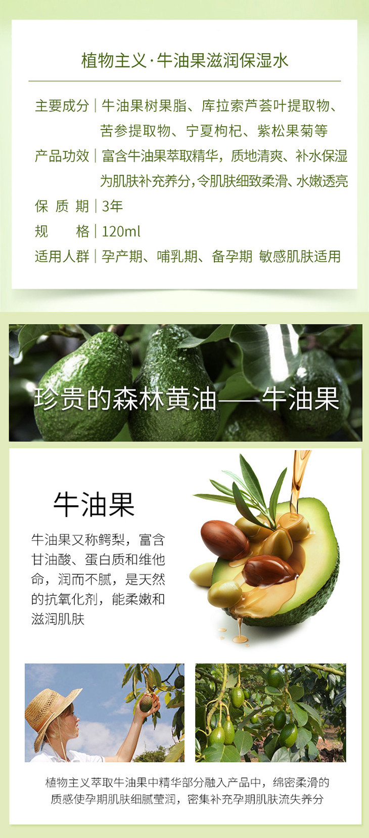 | 品名: | 植物主义牛油果滋润保湿水120ml爽肤水孕期化妆品补水哺乳期护肤品 |