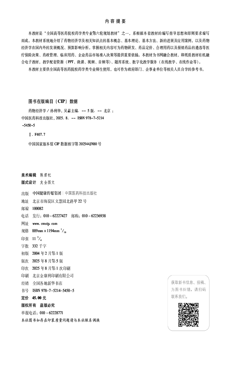药物经济学 第5五版(全国高等医药院校药学类专业第六轮规划教材)孙利华 吴晶 供药学类专业用9787521454505中国医药科技出版社
