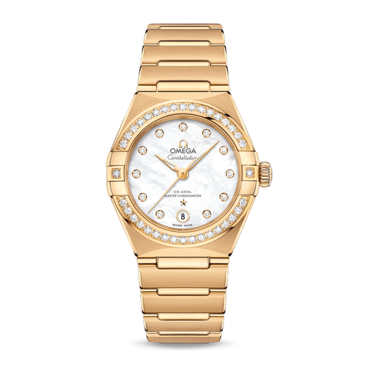 镜面材质 | 蓝宝石水晶玻璃 | 表盘 | 黄色18K金腕表,表圈铺镶钻石 珍珠母贝表盘饰有钻石小时刻度,6点钟位置设有日历窗口。表链、指针、欧米茄品牌标识、星座徽标以及钻石托槽亦以黄色18K金打造而成。 透底 |