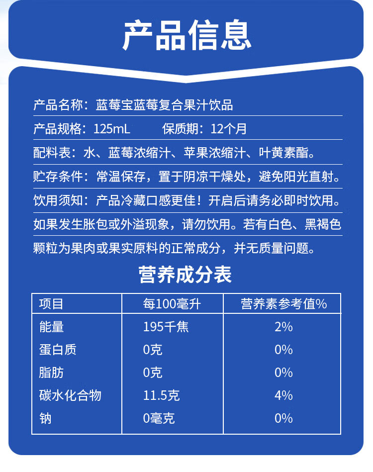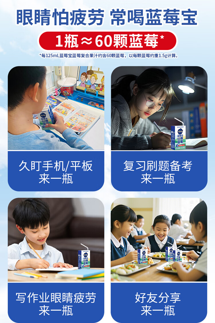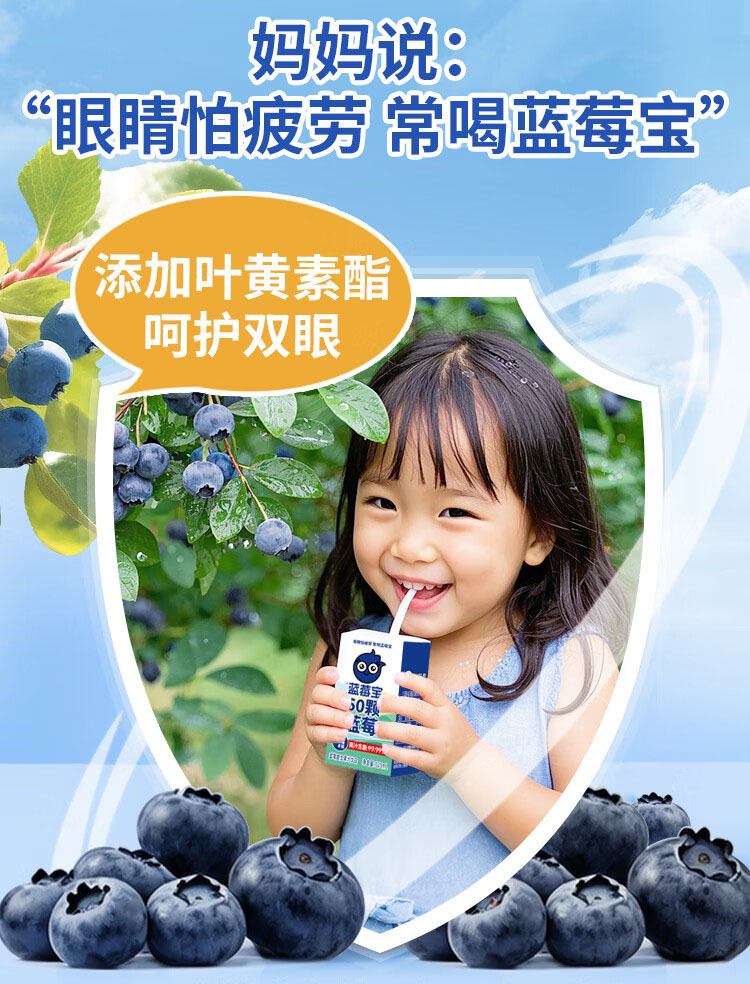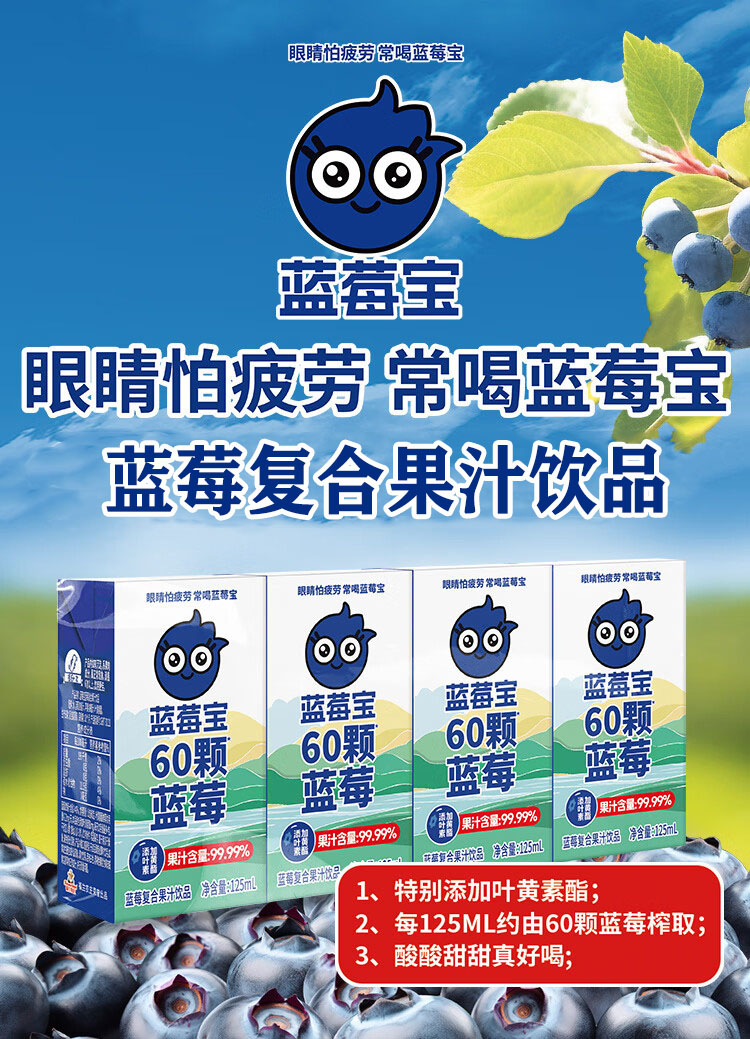 蓝莓复合果汁饮品,36瓶装,鲜果采摘低温榨汁,富含花青素和叶黄素酯,口感酸甜适中,醇厚柔和,健康饮品,配料干净,“眼睛怕疲劳,常喝蓝莓宝”M