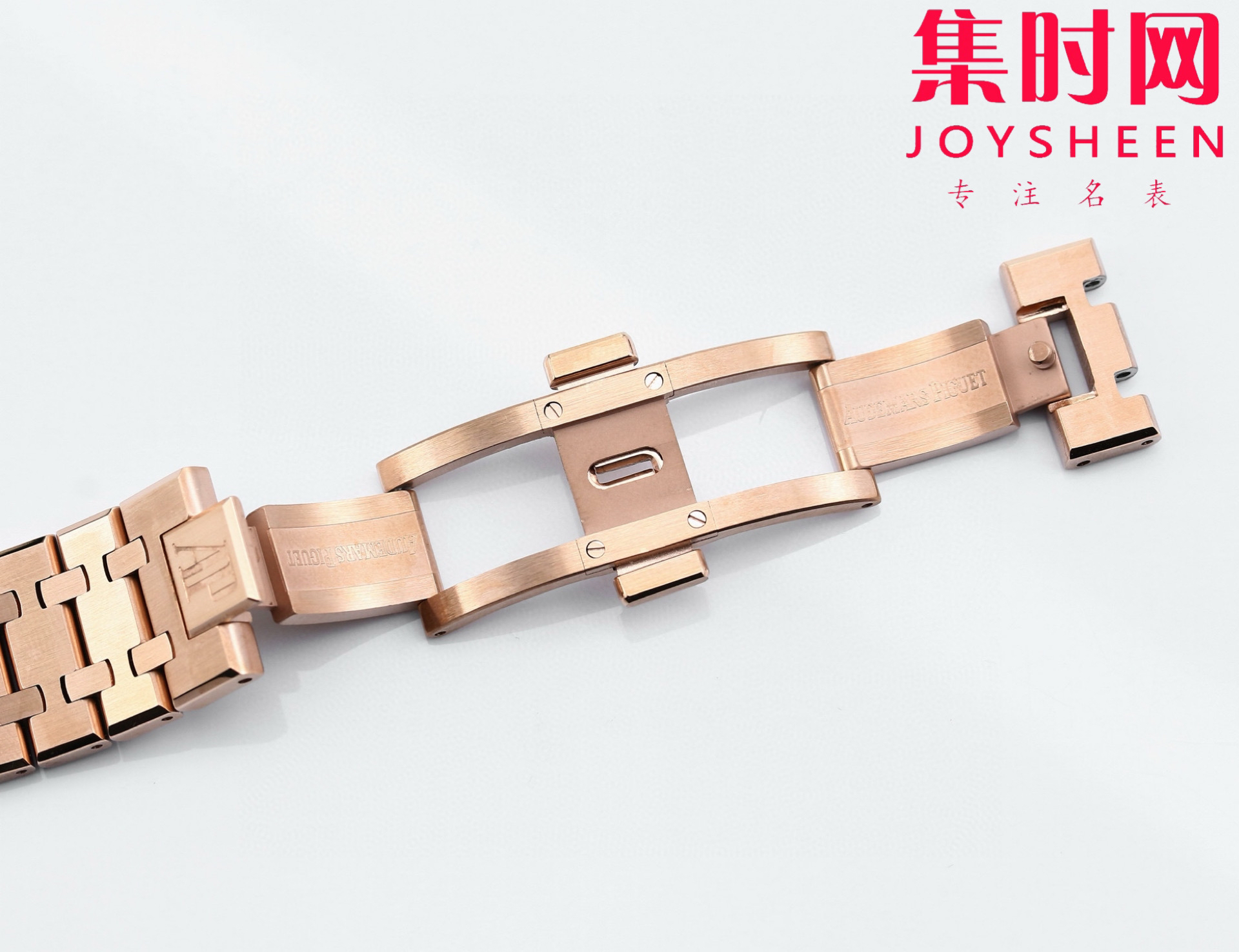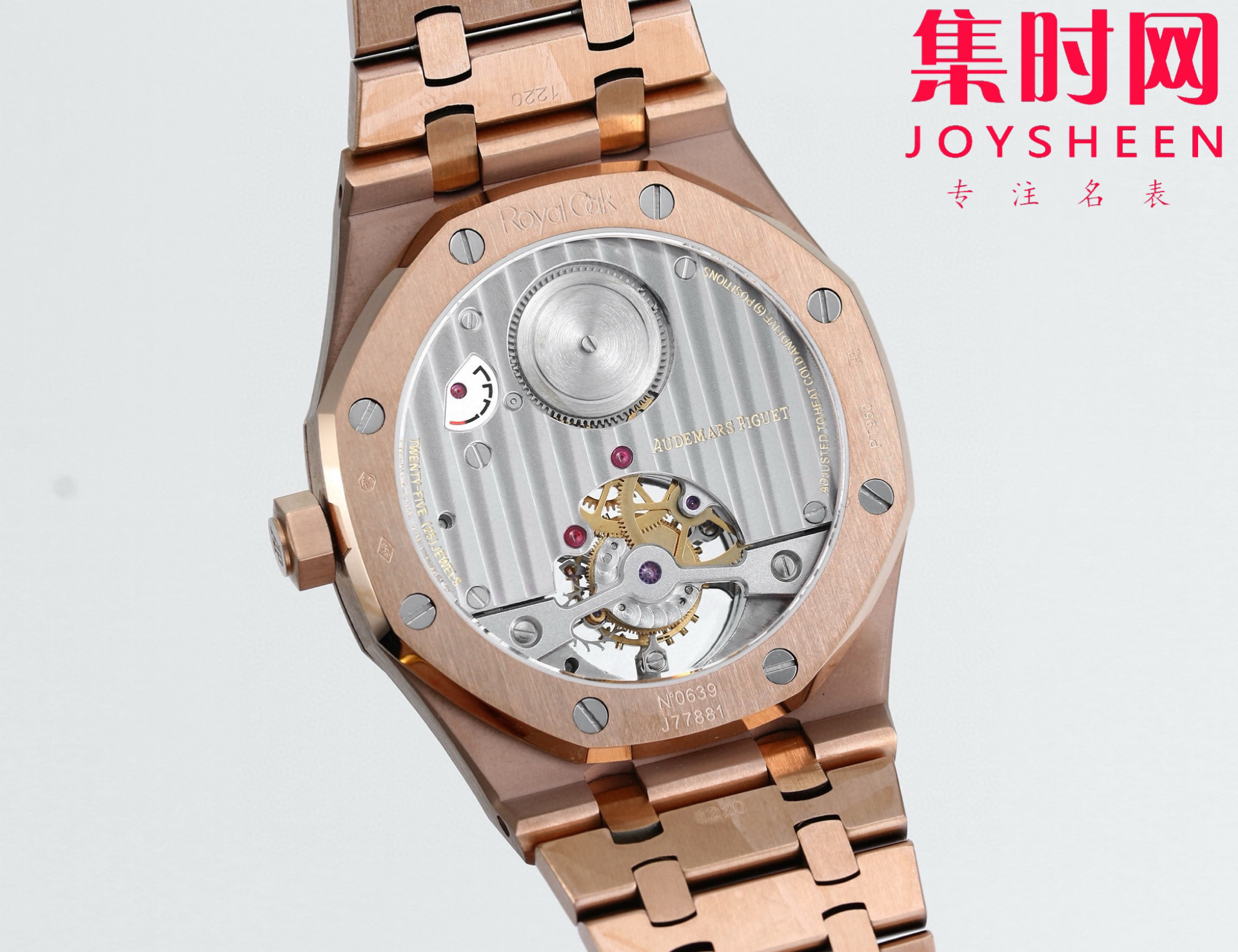 搭载du家订制Cal.2924手动上链陀飞轮机械机芯,爱彼依旧保留的八角形表圈、标志性的六角形螺丝以及经典表带,皇家橡树系列超薄陀飞轮腕表在经典的“Tapsisserie”格纹上进行再度创新,形成了新的格纹“Tapisserie Evolutive”。熟悉又陌生的表盘格纹装饰带来全新观感,成为这款腕表的点睛之笔。表壳直径为41毫米,厚度为11.2毫米,卓越不凡的陀飞轮,因此也得到广大表友的喜爱和关注。